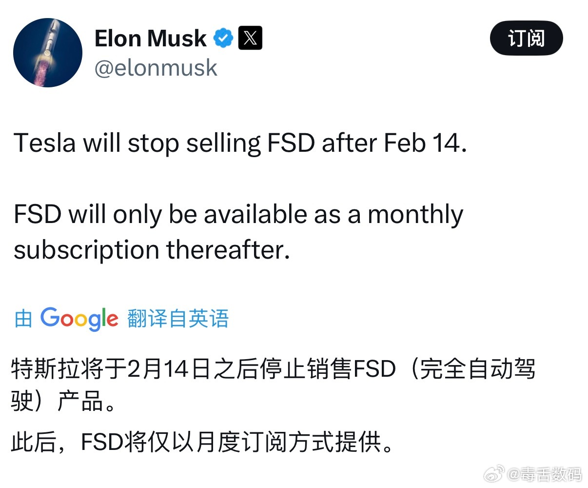 马斯克刚发文:2月14号之后停止销售FSD,仅提供订阅这改变了以前特斯拉的自