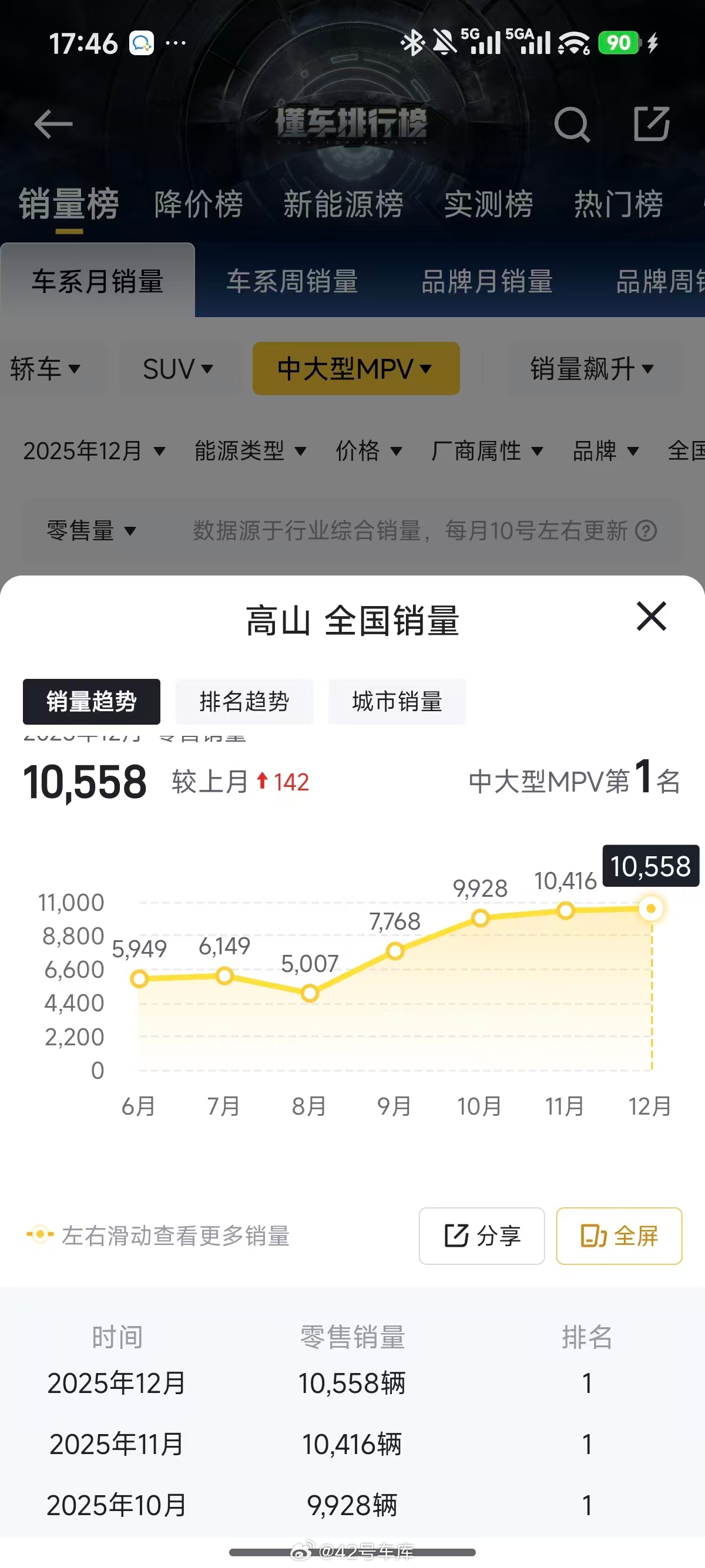 魏牌高山在去年 12 月的销量再次破万了,刚刚回看了一下去年 Q4 季度的中大型 MPV 高山一下连着拿了 3 次榜首,这个成绩还是非常不错的,我们去年的时候也买了一台高山 7 当工作车,之前也对高山 7 的各个维度都进行了详细的测试,正在考虑高山的朋友可以通过以下传送门回看一下我们之前的内容:- 魏牌全新高山 7,家庭的许愿车?网页链接- 年纪轻轻的我怎么就开上 MPV 了?网页链接- Hi4 技术解读 网页链接- 四驱技术解读 网页链接魏牌高山全国MPV销量冠军