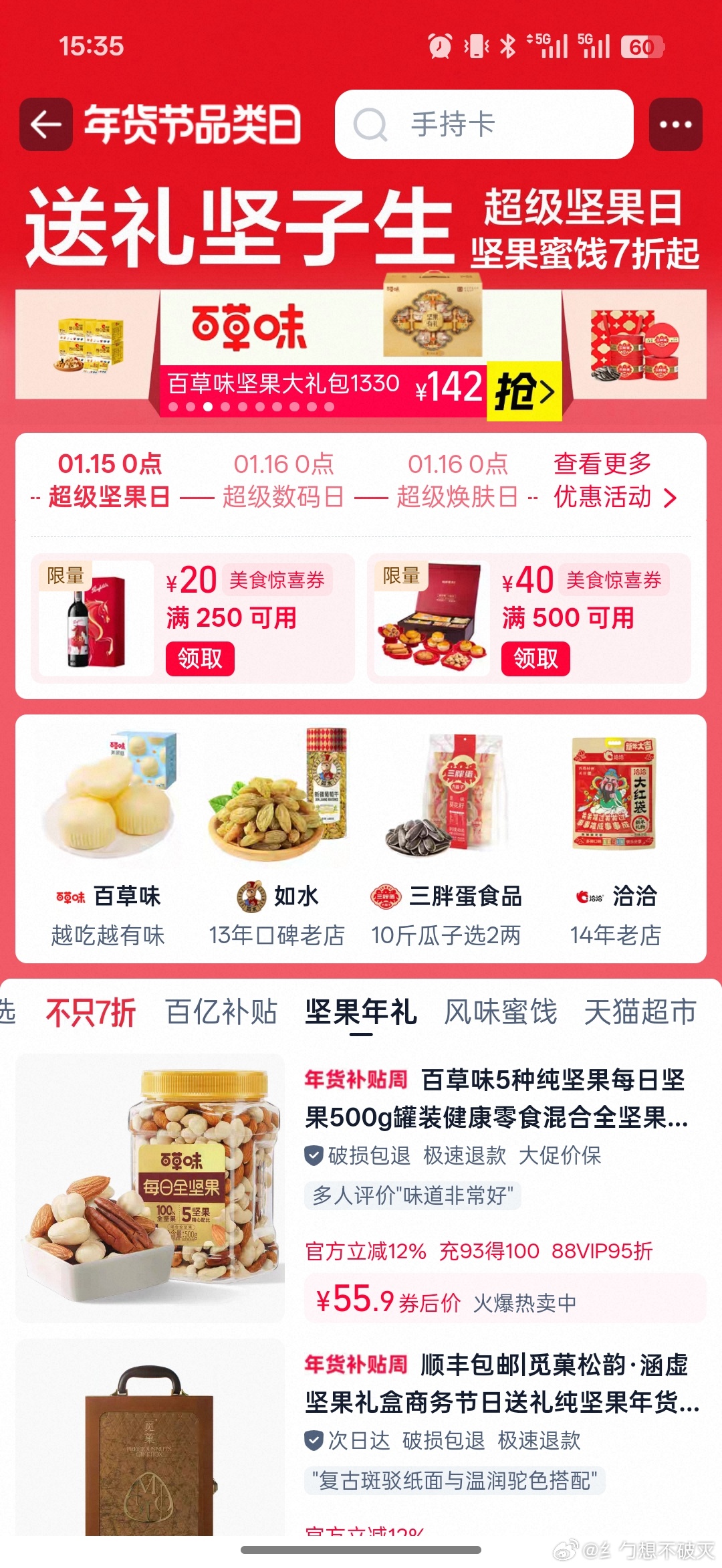 年货主理人请就位 挖到百草味年货宝藏!故宫联名国风礼盒,烫金云纹自带贵气,8罐纯坚果颗颗饱满酥脆,低GI健康无负担,走亲访友拎它,邻居都追着问链接~天猫超级品类日坚果坚果礼盒年货国风