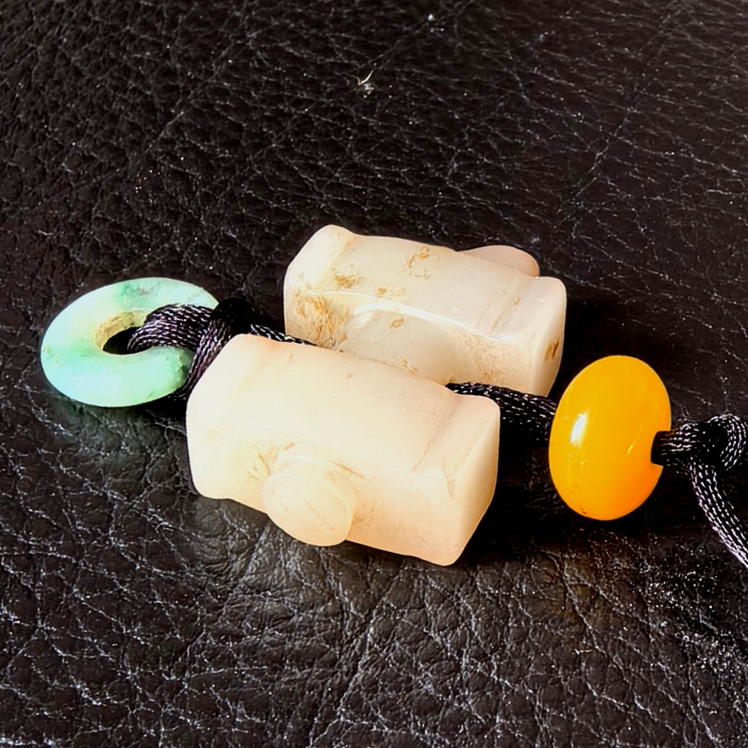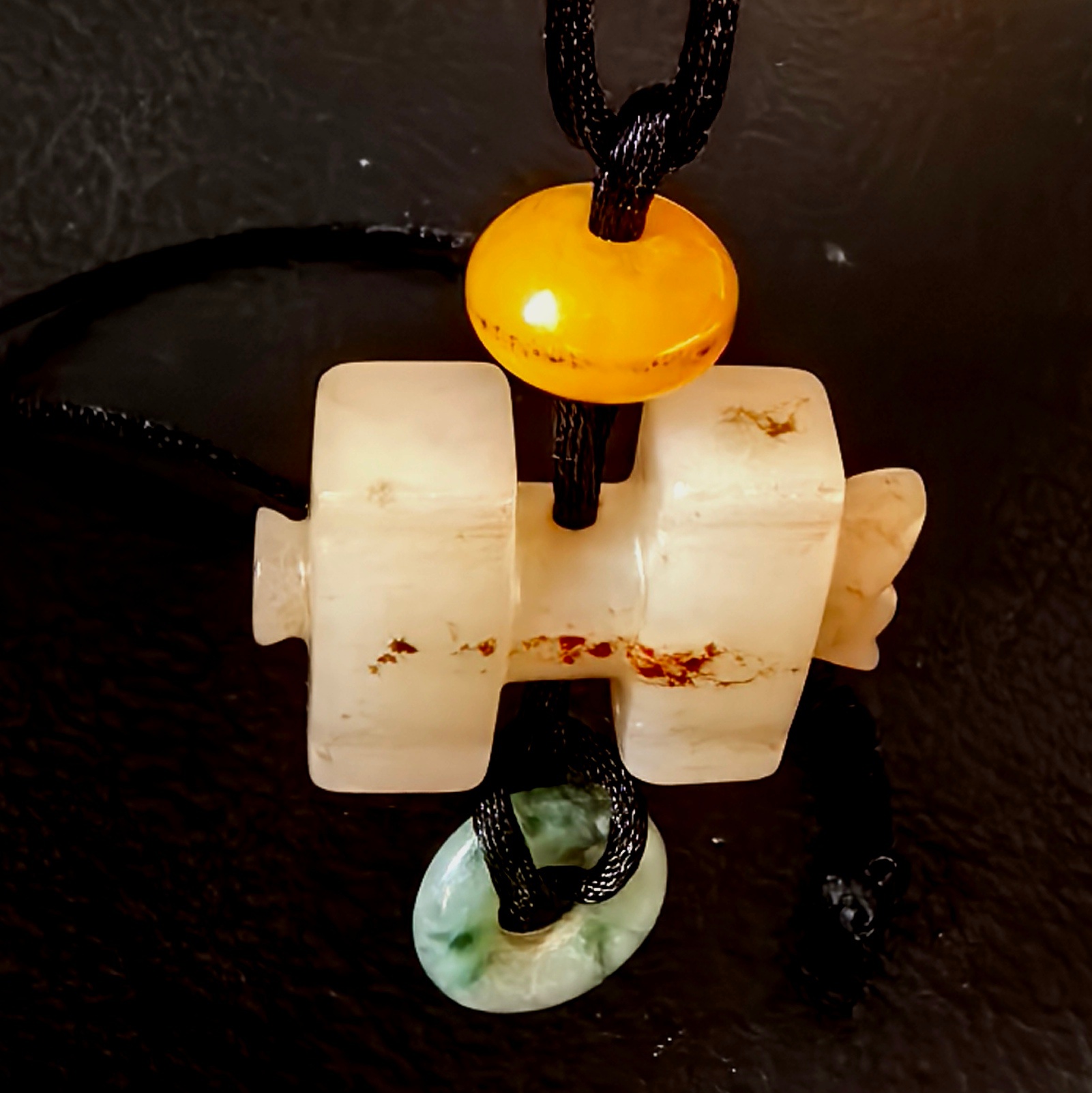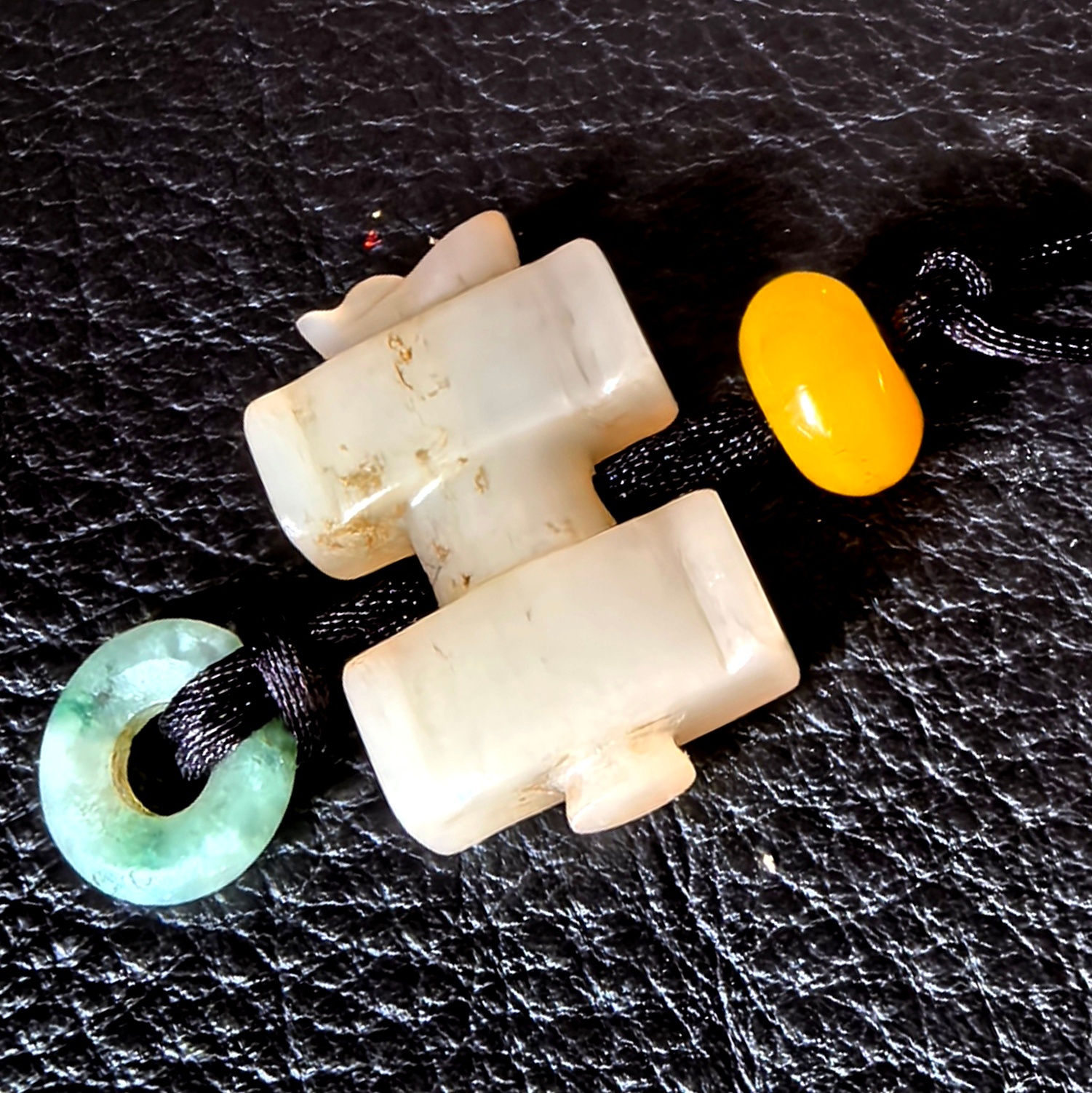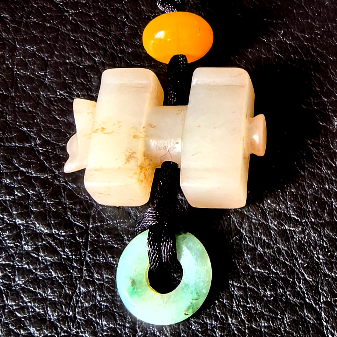 古玉杂谈 汉代司南佩,新疆和田籽料质地,中间串孔,与工字佩有些类同。老气横秋,旧