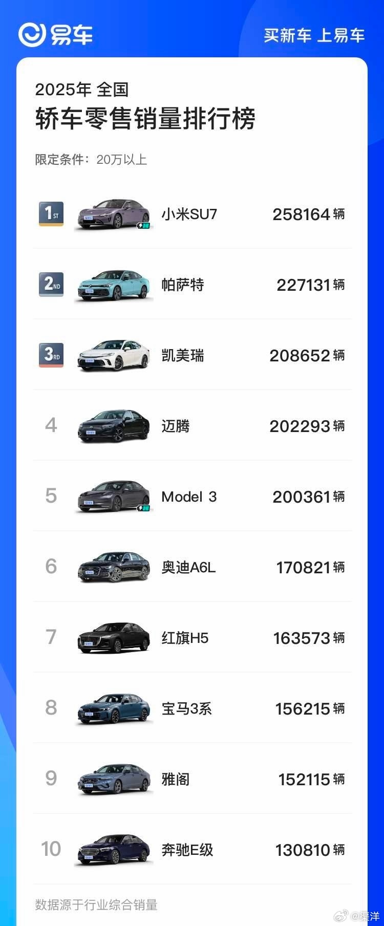 小米汽车25年战绩太能打了!全年交付411837辆,同比直接涨了近3倍,新能源品牌排名冲到第7,去年还是第16,稳稳超过蔚小理。反观特斯拉销量小幅下滑,小米这增速在行业里妥妥的标杆。雷总定的26年55万辆目标,靠着YU7完整交付年、新一代SU7还有待发布的新车,肯定能超额完成!SU7直接终结Model 3的销量神话,首个完整年交付258164辆,月均2.15万拿下20万以上轿车第一,帕萨特、凯美瑞这些燃油常青藤都比不过,上市没改款还能霸榜,新一代车型马上来,明年照样碾压同级。YU7是真能和Model Y掰手腕,冬测全面领先,续航、配置、智能都更能打,上市半年就卖了15万辆,连续5个月中大型SUV销冠,12月全品类销量第三,订单还没清完又出了3年0息,26年超过Model Y绝对有戏,小米汽车未来真的很稳!