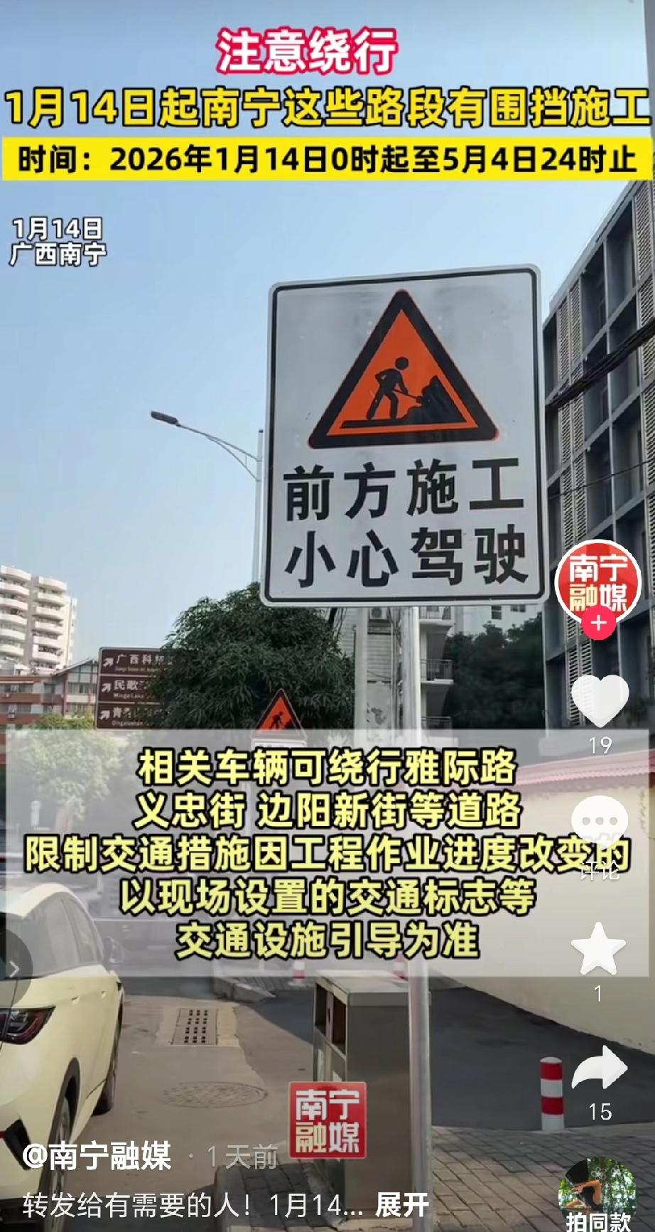 北际路(雅际路-边阳新街)因施工临时交通管制,施工时间:2026年1月14日0时起至2026年5月4日24时止。 机动车仅允许由北向南方向通行(雅际路往边阳新街方向),禁止机动车由南向北方向通行(边阳新街往雅际路方向),非机动车、行人可正常通行。相关车辆可绕行雅际路、义忠街、边阳新街等道路,交通限制措施若因工程作业进度改变,以现场交通标志和设施引导为准。(来源于@南宁融媒)