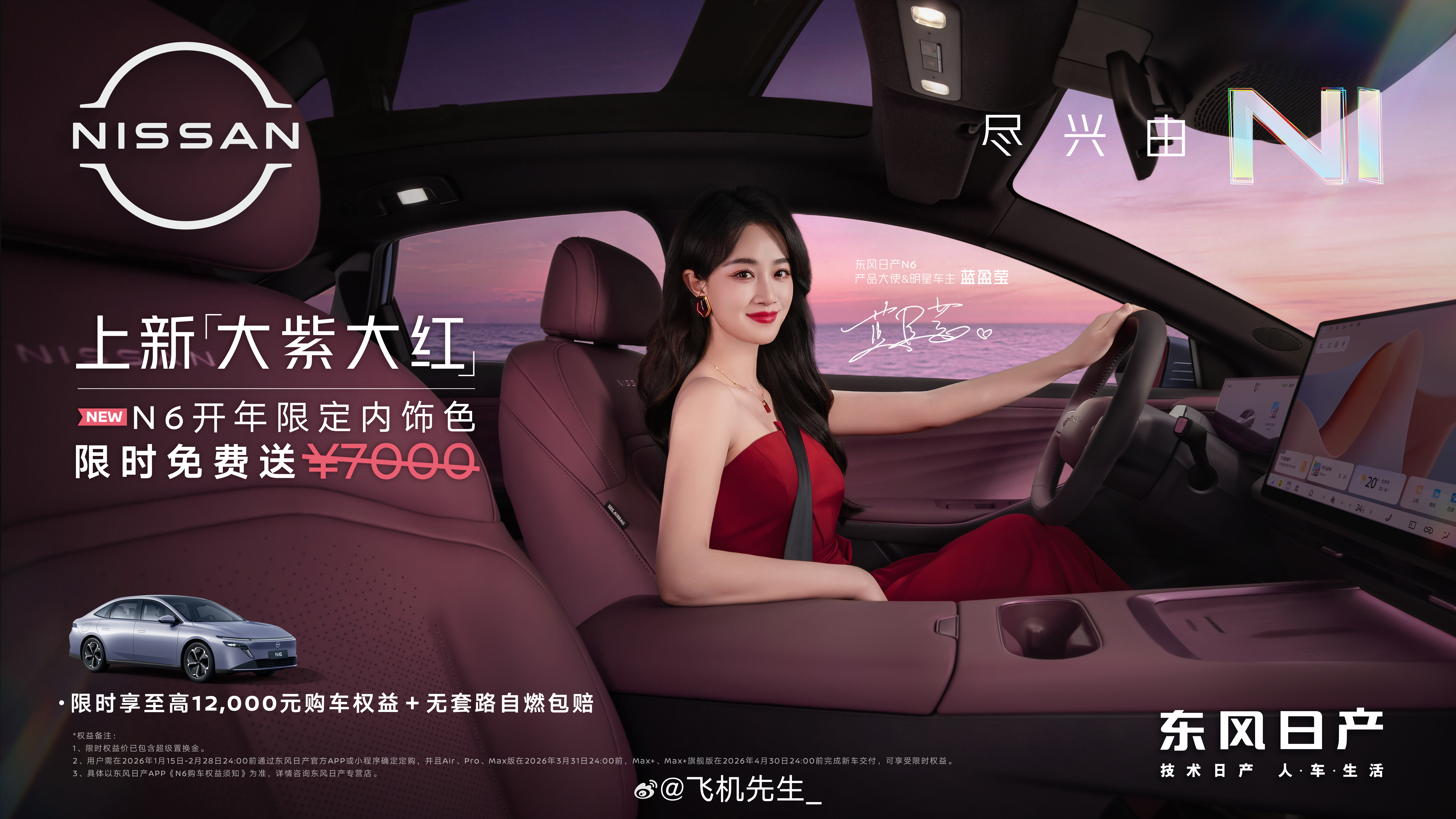 东风日产 N6 迎来了一个新颜色,有个非常接地气的名字「大紫大红」。和大家分享更多的细节图,组合氛围灯高级感更强,这次并没有用上高饱和的紫,或者纯红,而是调出了一个新颜色!红调更有活力加上紫色更有高级感,和大家分享几张颜色还原度更高的车内细节图!这些年东风日产也抓到了很多营销的策略,也推出了更多特别版。这次紫红内可以搭配紫外色,选装 7000 元现在直接限时免费。东风日产东风日产n6