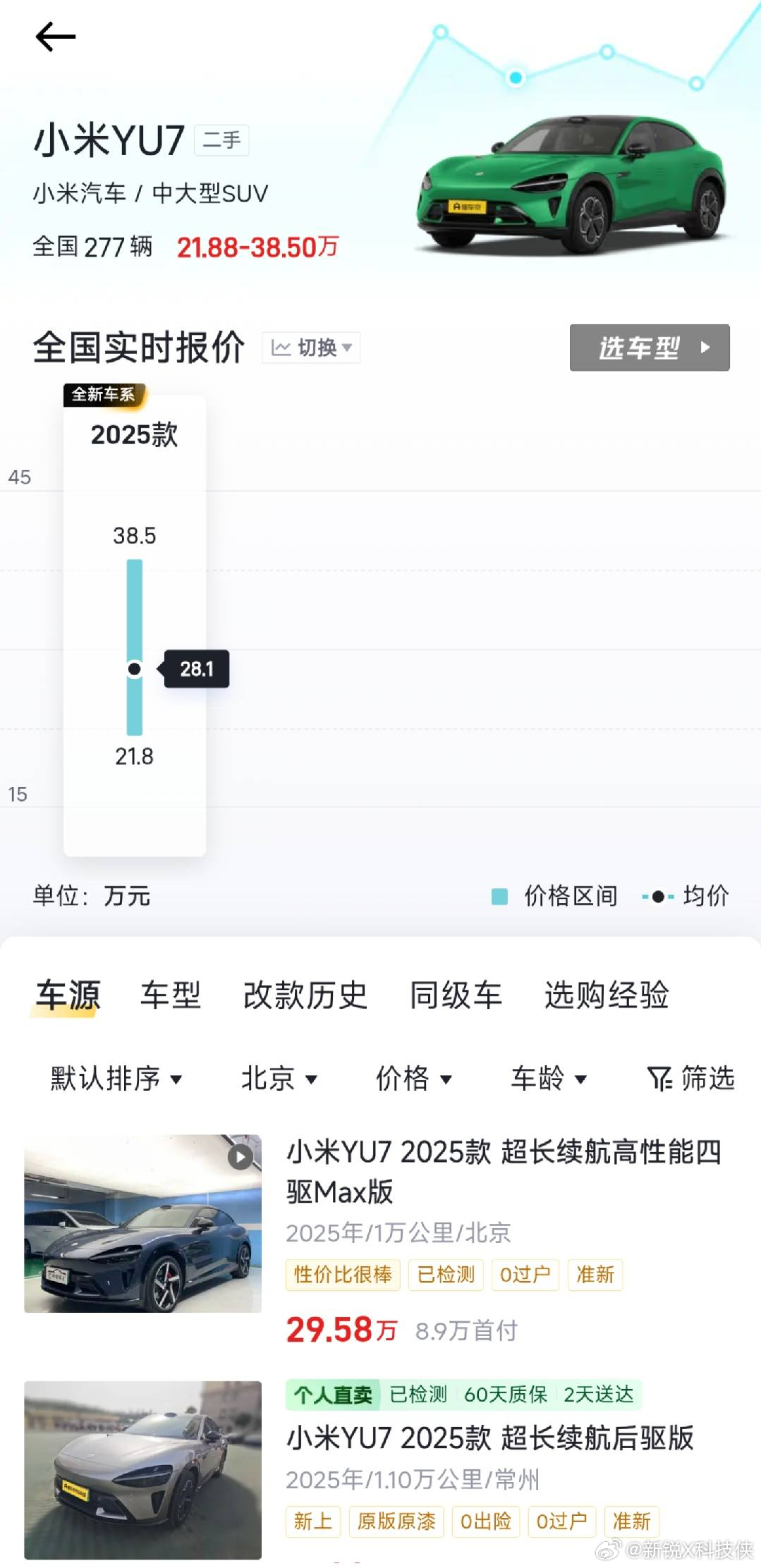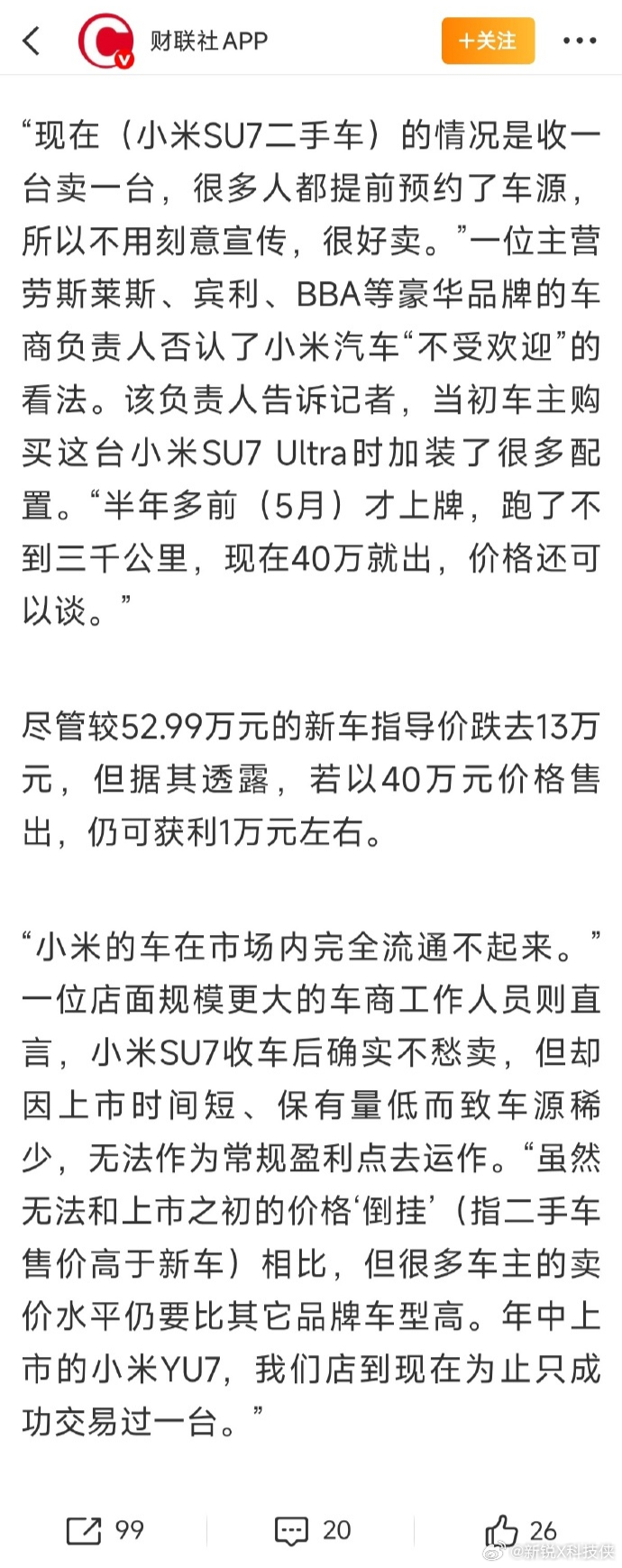 小米二手SU7 Ultra35万没人要先和大家说说市场情况:现在二手车平台上,24款SU7均价20.7万,比25款Model 3二手均价还高,而且基本是来一台卖一台。保值率能到88.91%。其实这对于一款上市两年的纯电车型来说,这成绩确实说得过去,而且小米的市场认可度大家有目共睹。再看那些车商的操作,下跪、做法、哭穷卖惨,为了卖车啥招都使。本质是啥?就是制造价格争议引流,好低价收车、高价卖车赚差价啊。就吃准了大家爱看这种戏,互联网玩得门儿清。所以大家没必要被那些炒作带偏,也别被制造的价格焦虑牵着走。小米SU7的二手表现,有数据有市场反馈做支撑,咱买车看真实行情就行,别被一些套路忽悠,保持点分辨力就够了。