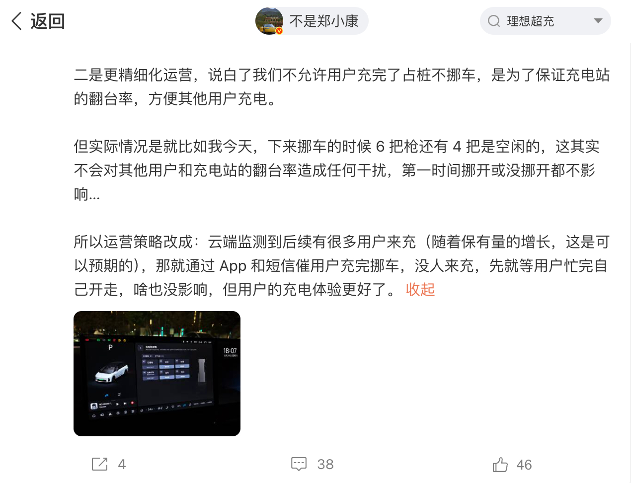 特斯拉超充修改了运营政策,当且仅当你已经充好了,其他充电位也都在充,满 20 分钟才会产生超时占用费。改得非常好,非常改善用户体验。那么问题来了,我俩月前喷了理想超充,理想改了吗。