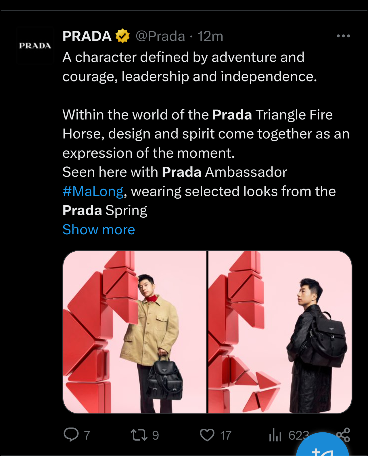 prada代言人马龙 Prada ins fb x发布各位有号的可以夸夸马龙嘛A character defined by adventure and courage, leadership and independence.Within the world of the Prada Triangle Fire Horse, design and spirit come together as an expression of the moment.Seen here with Prada Ambassador MaLong, wearing selected looks from the Prada Spring Summer 2026 collection.这是普拉达品牌代言人马龙,身穿普拉达2026春夏系列新品。