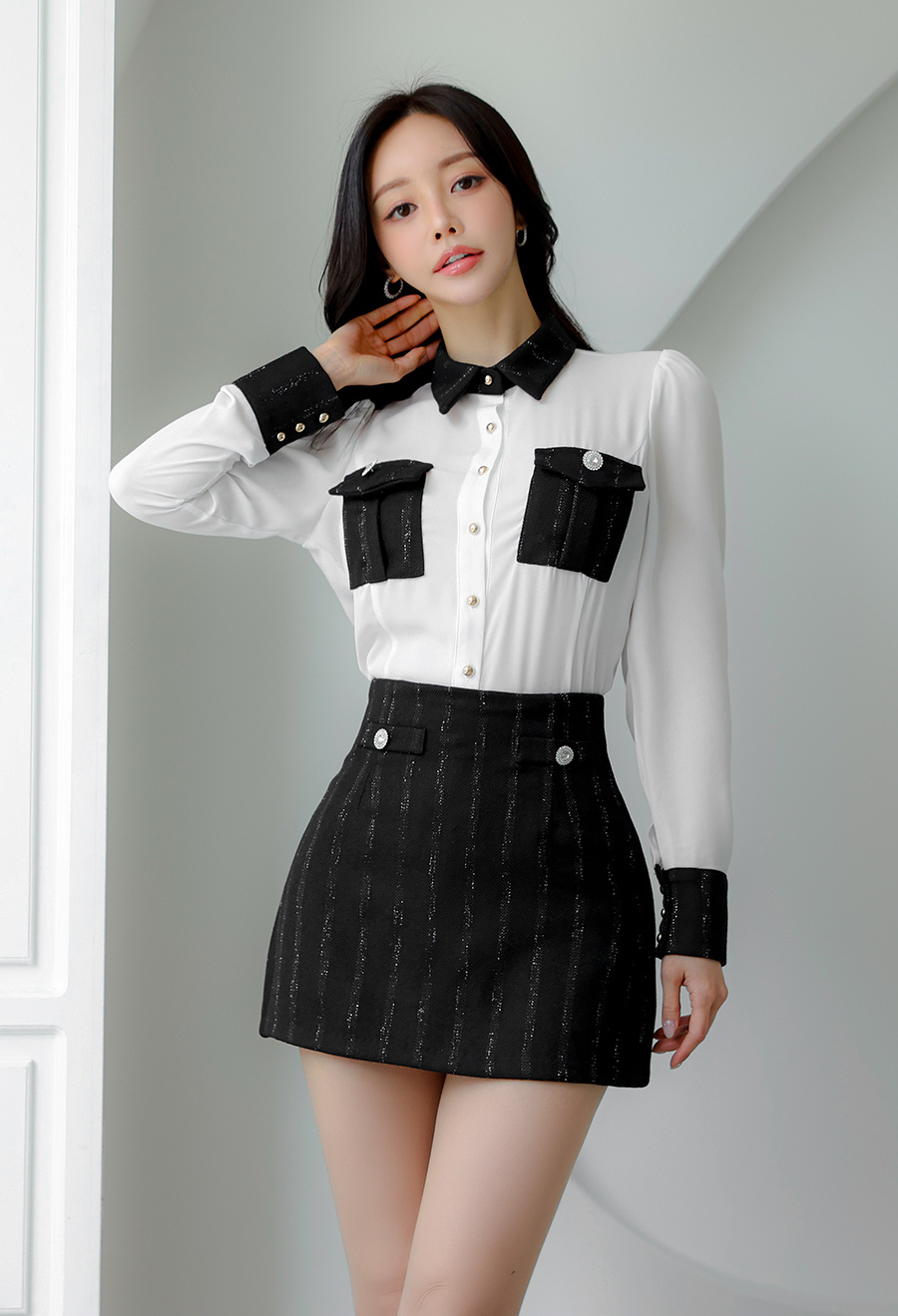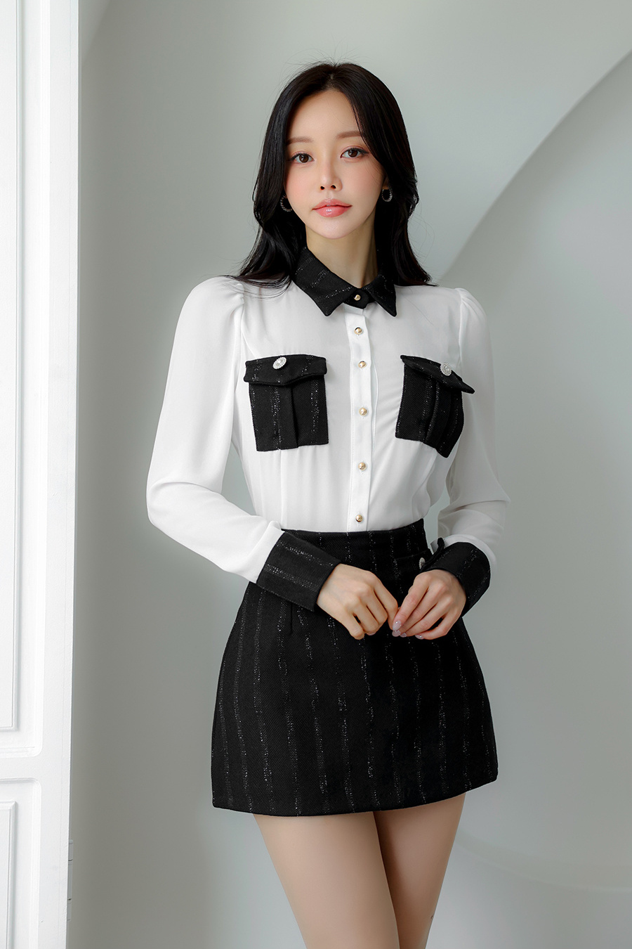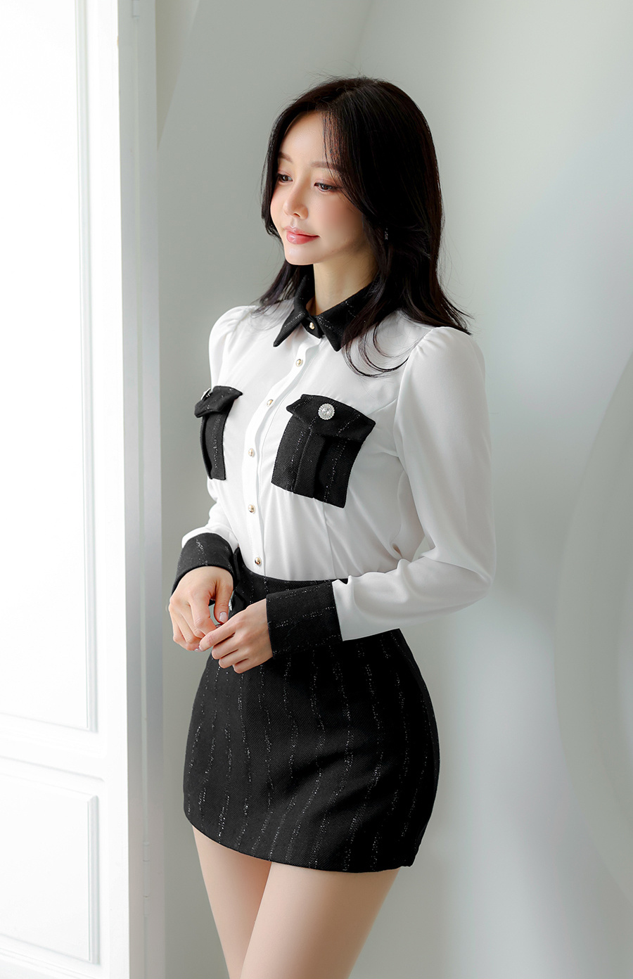 清冷温柔的孙允珠,一头柔顺的红棕色长发自然垂落,,在简约的环境中显得格外亮眼。