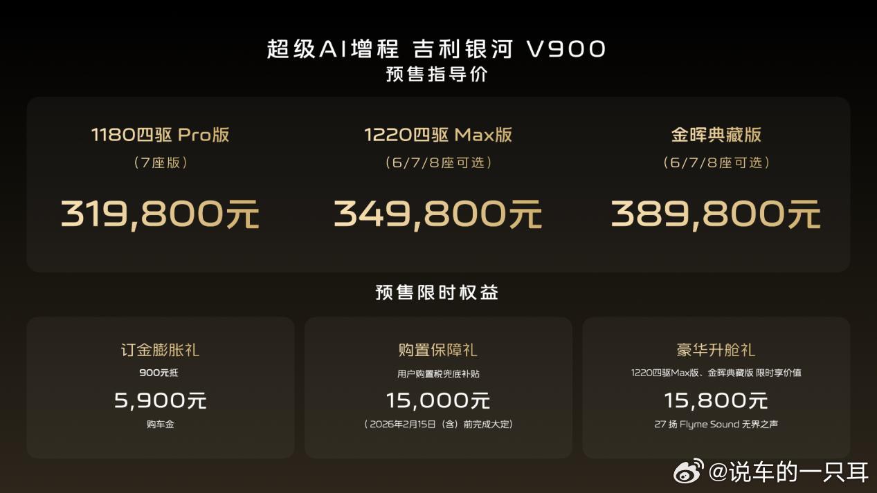 吉利银河V900预售价出来了:31.98~38.98,万元,按照“国际惯例”,实际售价估计再减个1w也就差不多了。三款配置的区别主要在电池和座位。最低配车型仅7座可选,并且搭配43.36度电池。另外两款配置是6/7/8座可选。银河V900最有意思的地方就是三排座椅(6/7座)的平权,第三排空间还是座椅舒适度都几乎和第二排一样。8座版本是可以折叠的,翻过来还能当钓鱼座。中高配车型带空悬,实际体验是那种比较干净利落的,支撑性在这个体量车型下已经非常优秀了。另外,银河V900的做工确实是目前最好的银河车型,特别是内饰。吉利银河V900预售价31.98万元起