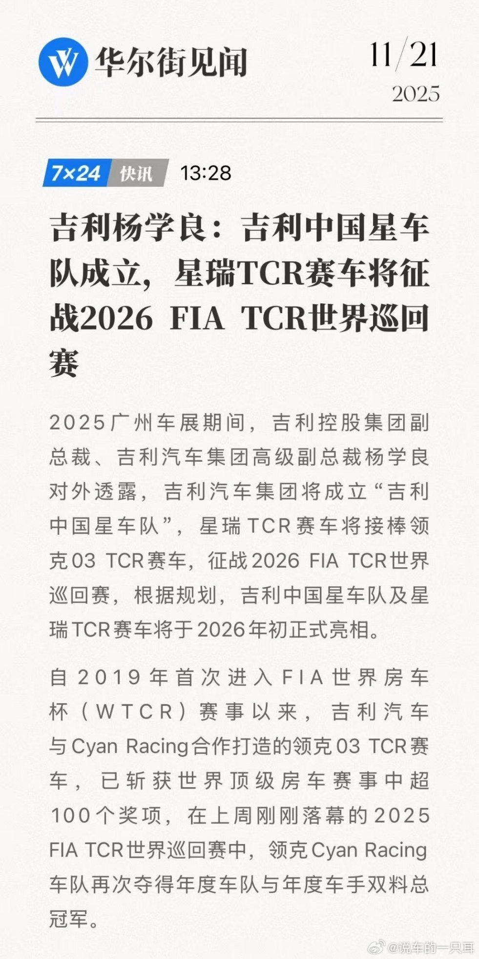 吉利星瑞TCR赛车即将参加2026 FIA TCR世界巡回赛。历史回顾:吉利星瑞TCR赛车是从领克03 TCR手中接过的冠军接力棒。领克03 TCR不仅让中国车获得冠军,也培养了中国冠军车手。展望:在将来,吉利星瑞TCR赛车还会覆盖更多的赛事,包括“平民赛事”超吉联赛PRO,只要你有驾照,就可以报名,通过培训后就可以拿到国家B级场地赛照(我同款),之后,即可参赛。吉利一直在国内执着的进行赛车文化的推广,而且现实落地。超吉联赛、领克杯,让热爱有处安放。吉利星瑞TCR加油!吉利加油!中国汽车加油!