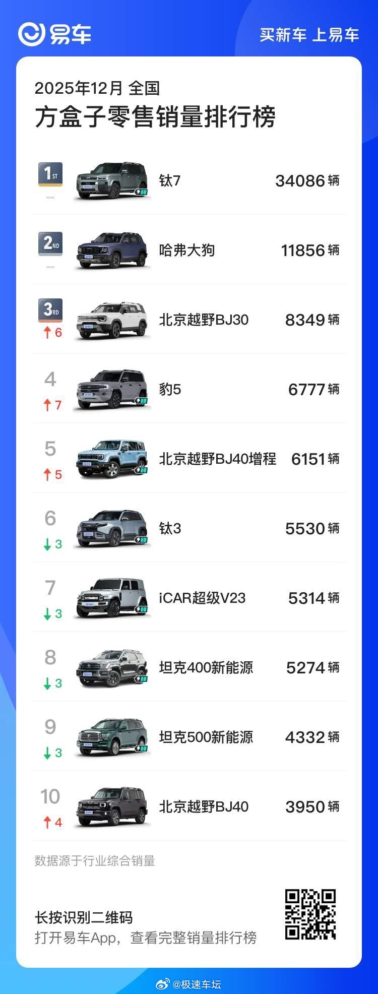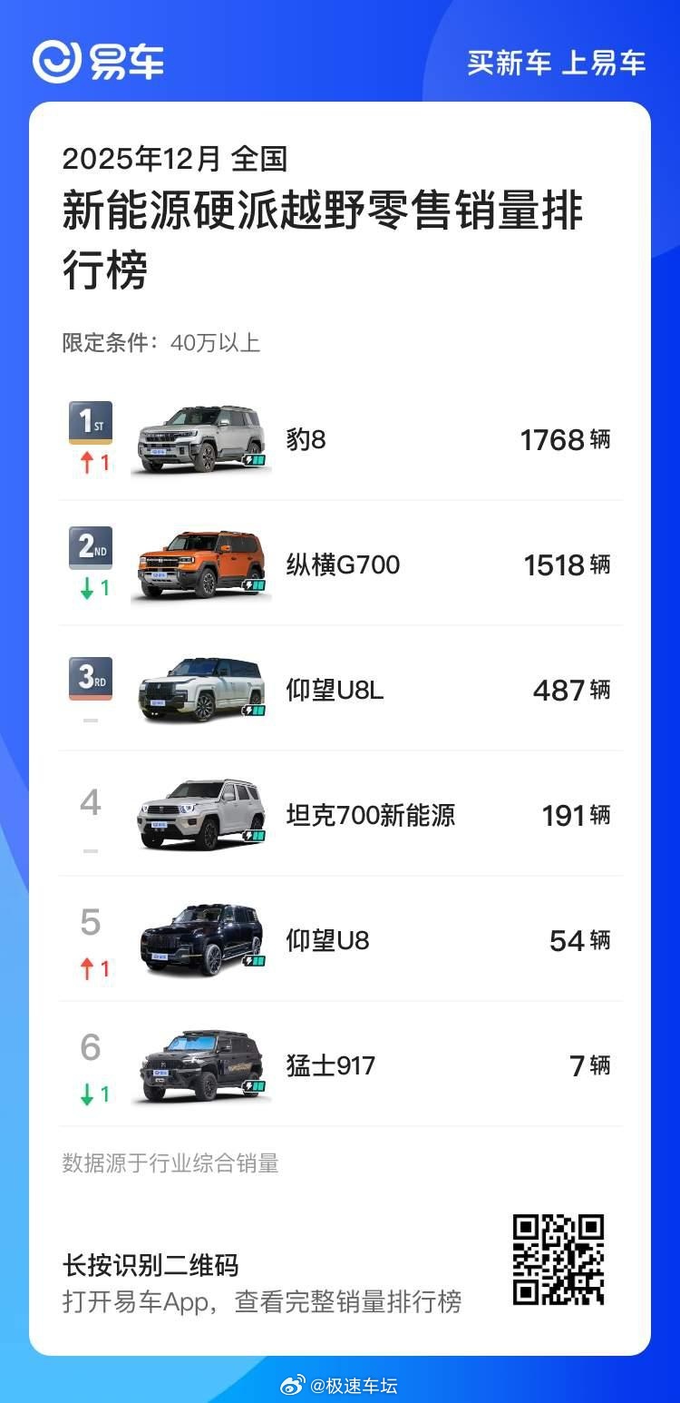 方程豹 款款爆款,冠军收官🏆钛7 蝉联混动SUV+方盒子双冠军豹5 硬派越野全