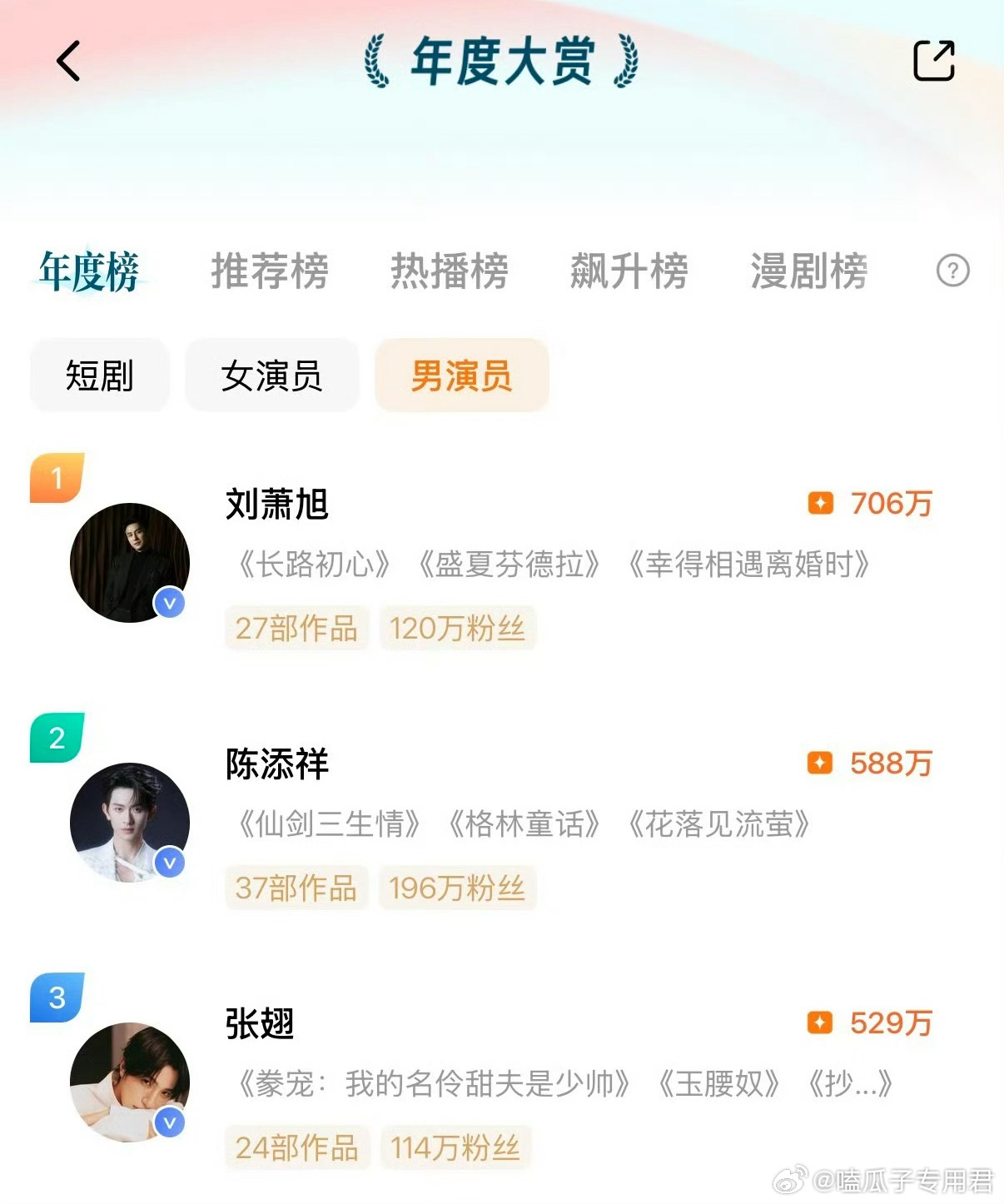 红果年度大赏前TOP3分别是女演员Top3 :1️⃣郭宇欣1070w 2️⃣王格格 600w3️⃣岳雨婷 512w男演员Top3:1️⃣刘萧旭706w2️⃣陈添祥588w3️⃣张翅529w