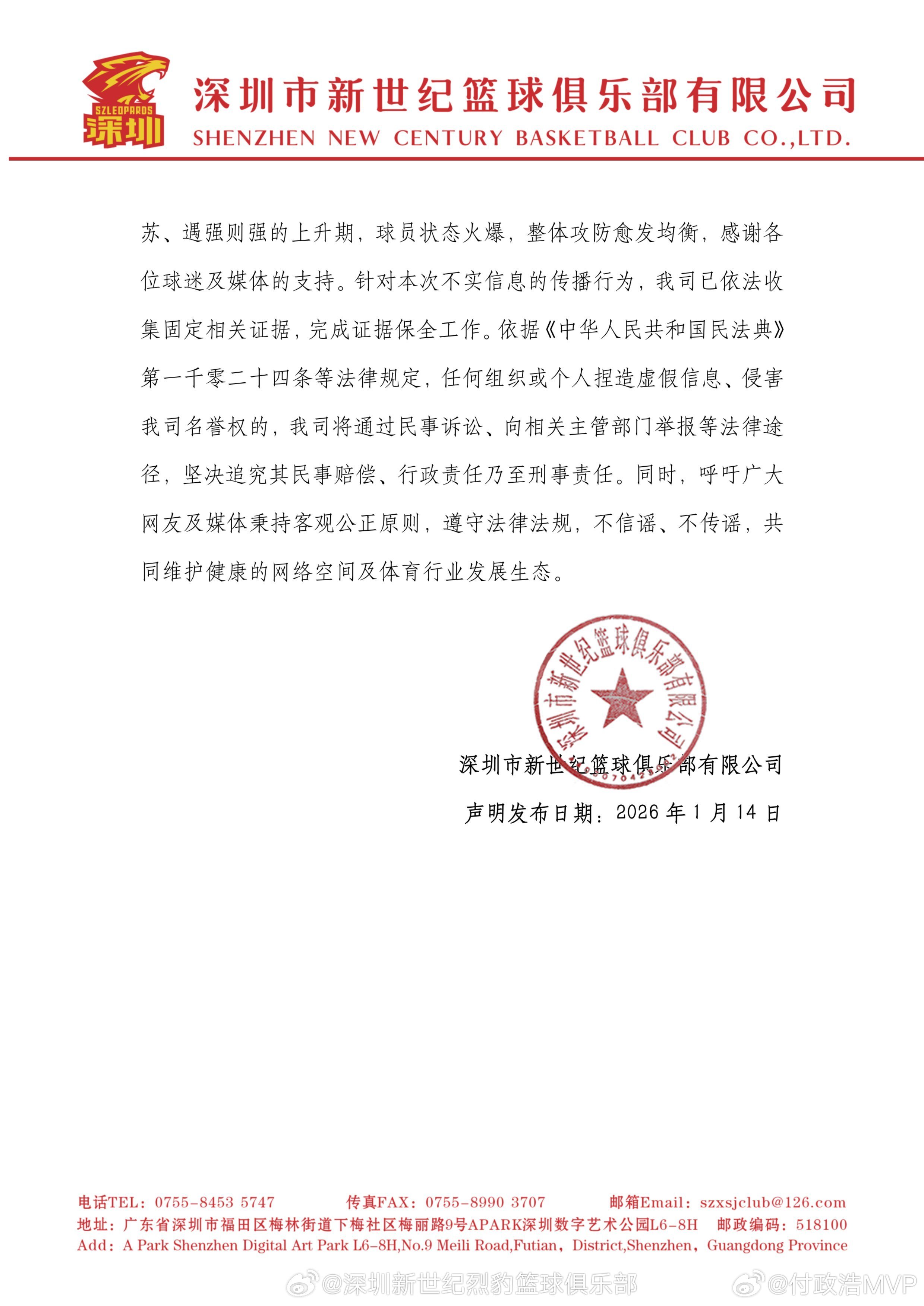 深圳男篮发声明辟谣,称有头条账号散布《深圳欠薪28个月!王浩然转会疯传》的不实消息。深圳男篮声明:按时足额发放球员薪水,不存在“欠薪3-9个月,拖欠社保28个月”、“资金链断裂、禁签外援导致只能全华班出战”的情况,“王浩然转会广东、索要徐杰级别补偿”为虚假消息,已固定证据,将依法追究责任。