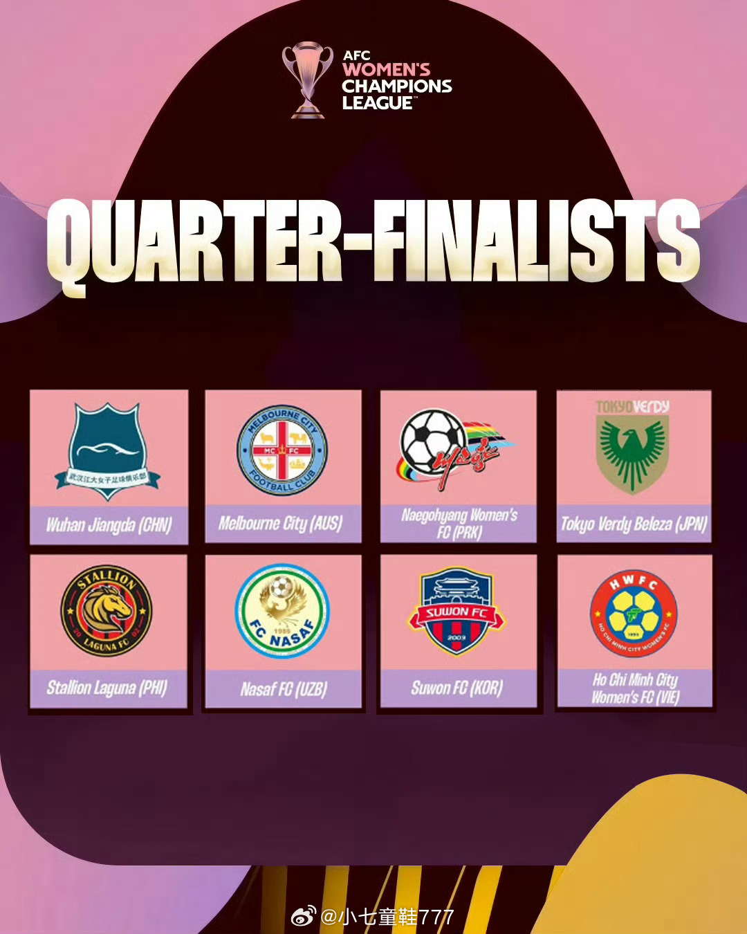 武汉女足亚冠八强战迎战水原女足2025/26赛季亚足联女子冠军联赛淘汰赛阶段抽签结果出炉,卫冕冠军武汉车谷江大女足将在主场迎战韩国水原FC女足,1/4决赛将为单场淘汰赛制。比赛将于2026年3月28日-29日进行,目前具体比赛的时间尚未确定。根据同组回避原则,从同一小组晋级的球队不会在1/4决赛中相遇。1/4决赛中,第一档球队拥有主场优势,四支胜者将晋级集中决赛阶段比赛。随后,半决赛和决赛均为单回合比赛,将于2026年5月20日至23日在待定的集中场地举行,以决出最终的冠军。2025/26赛季女足亚冠八强对决:墨尔本城女足(澳大利亚)vs纳萨夫女足(乌兹别克斯坦)日视东京绿茵美人(日本)vs内湖公马女足(菲律宾)内古香女足(朝鲜)vs胡志明市女足(越南)武汉车谷江大女足(中国)vs水原FC女足(韩国)武汉车谷江大女足武汉女足女足亚冠武汉足球
