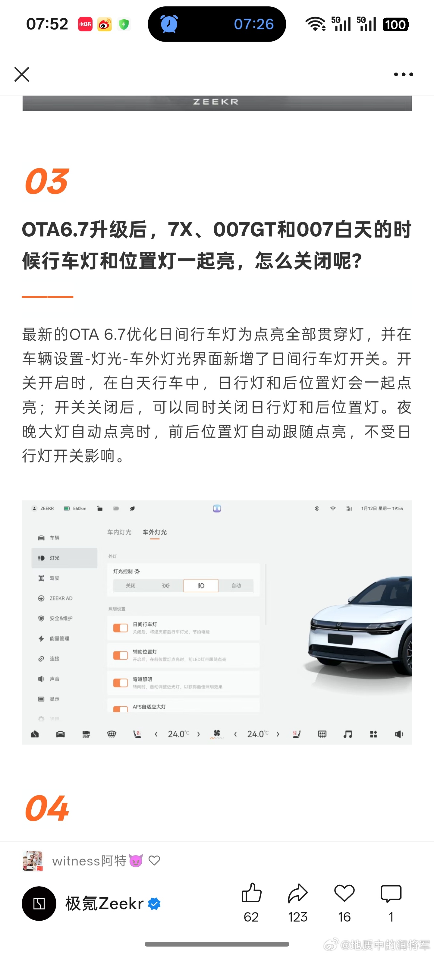 最新一期的问答来了,两个核心问题都有了解答。1.目前ota 6.7已经全量推送,各位车主们可以检查一下,如果还有没收到的可以咨询管家或者直接去极氪家刷新哈2.关于大灯点亮的问题,现在也新增了日行灯开关,想开关的可以自己选择哈 极氪