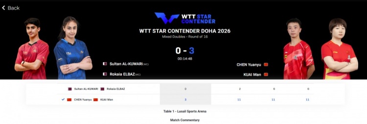直播吧1月15日讯2026年WTT球星挑战赛多哈站混双1/8决赛,陈垣宇/蒯曼3-0库瓦里/埃尔巴兹,晋级八强。