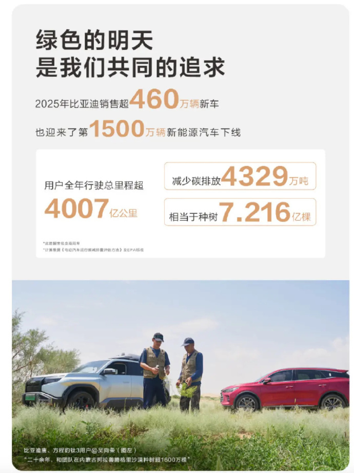 比亚迪辅助驾驶系统激活率超94% 近日,比亚迪汽车官方发布了2025比亚迪用户年度出行报告。其中提到,2025 年比亚迪销售超460万辆新车,也迎来了第1500万辆新能源汽车下线。用户全年总行驶里程超4007亿公里,减少碳排放4329万吨,相当于种树7.216亿棵。另外,比亚迪天神之言辅助驾驶系统的智能泊车激活比例达到85.97%、辅助驾驶激活比例达到94.13%,AEB(自动紧急刹车系统)触发次数达到 933 万次。