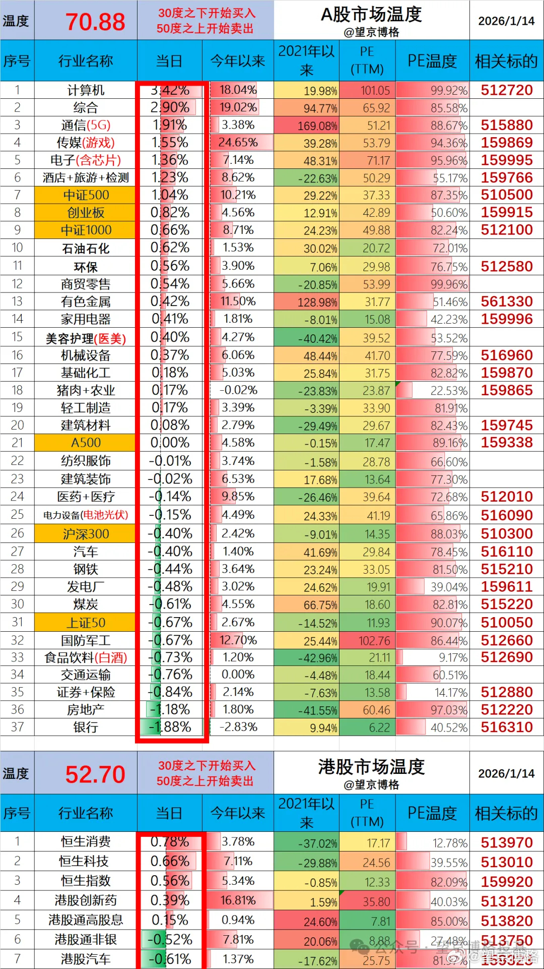 (1)场内ETF账户今日盈利1.5万(资产260万);最近AI应用比较火,按之前互联网逻辑,AI应用的市场规模应该是AI硬件市场规模10倍,也就是说AI应用也会诞生超级应用。博格在下午回调中买入5万传媒ETF(512980),没想到收盘竟然是赚钱的,这个操作有点追高了,若未来回调的话可能进一步加仓(私域已经披露,不作为发车,偏稳健的投资者要谨慎对待)。(2)场外基金账户今日盈利2.7万(资产550万);主要重仓的恒生医疗、港股主动基金、资源基金今天涨了不少,所以场外基金账户波动不太大。两个账户合计盈利4.2万,盈利比例0.52%周一盈利11.0万,周二亏损2.0万,周三盈利4.2万,本周累计13.2万盈利,算是不错了。A股今天70.88度,相比上一个交易日下降0.2度;港股今天52.70度,相比上一个交易日上涨6.7度;老读者都知道,博格重仓军工、医药、恒生科技,今年以来军工恒生科技与医药涨都不错。大家今天盈亏如何?欢迎留言~感谢点赞与点爱心~A股行情A股