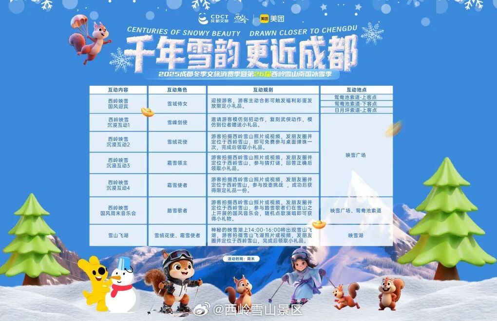 #西岭雪山雪地探宝大赛# 正式开启!这个冬天,来日月坪寻宝,体验星空夜滑,邂逅国风浪漫!❄️【冬日限定·雪地探宝】⛄西岭雪山“日月坪雪地探宝大赛”火热进行中!即日起,在日月坪广场的纯净雪域,藏有景区原创设计的限定文创盲盒(冰箱贴、奖牌、徽章等随机惊喜),找到就是你的!可自带工具,免费参与,快来开启你的寻宝之旅吧!【星空夜滑·梦幻灯光】🌌西岭雪山“夜间模式”已全面上线!作为西南首个真正意义上的夜间滑雪场,每日19:00-21:00,在全程亮灯的专业雪道上畅滑,感受音乐与星空相伴的浪漫。全山灯光秀同步点亮,带你进入一个动态光影的冰雪童话世界!【夜游集合·周末狂欢】🎪夜游项目同步开放!熊猫雪世界、雪上飞碟、雪地香蕉船、彩虹滑道、冰雕长城…等你来玩!每周六、日更有专属狂欢:➡️ 国风NPC惊喜现身,互动赢限定文创;➡️ 免费参与灯谜、投壶、舞剑等传统文化互动;➡️ 每日震撼上演“雪山飞湖”威亚表演秀!【服务升级·畅滑全球】🌍今年,西岭雪山迎来了大量海外游客。景区已全面升级多语种导览、跨境支付等服务,让全球游客都能畅玩无忧!这个冬天,不必远行,在西岭雪山就能收获宝藏、浪漫、狂欢与文化的多重体验!快约上小伙伴,一起来玩吧!⛷️#西岭雪山 ##雪地探宝##夜间滑雪##国风冰雪##成都玩雪##冬季旅游#