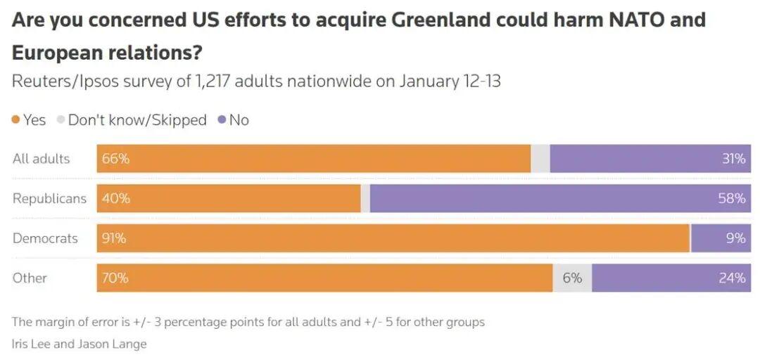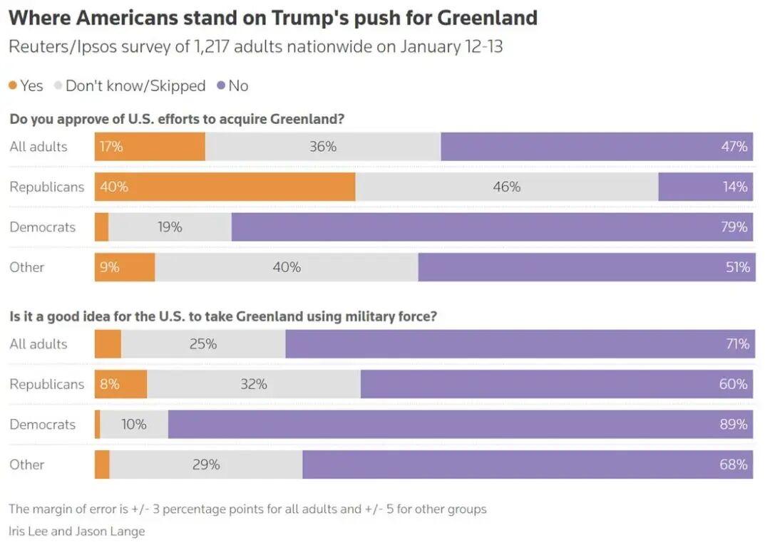 特朗普再次坚称,“出于国家安全目的,美国必须获得格陵兰岛”,该地区对“金穹”计划至关重要。他还称,如果不是因为有美军的强大实力,北约将没什么威慑力可言。他表示,“若将格陵兰岛掌握在美国手中,北约将变得更加强大、更具效能。任何低于这一点的结果都是不可接受的”。格陵兰和丹麦官员周三在白宫会见了万斯和鲁比奥。格陵兰的一位高官对《纽约时报》表示:“我们不会出卖自己的灵魂。我们并不愚蠢。” 丹麦及其盟国周三表示,他们将增加在格陵兰的军事存在,以开展“北极耐力行动”(Operation Arctic Endurance)演习的扩展部分,这项行动将包括“接收盟军、操作战斗机以及执行海上安全任务等”。丹麦国防部长保尔森表示,“北极的安全对丹麦王国及我们的北极盟友至关重要,因此,与盟友密切合作进一步增强我们在该地区的行动能力非常重要”。他还表示,丹麦国防军将与若干北极和欧洲盟友在未来几周内探讨如何实施在北极增加存在感和演习活动。目前至少有瑞典、荷兰、加拿大、德国参与相关行动。但到目前为止,这次演训仍属于政府间合作,尚未得到北约的正式批准。 据NBC披露的一项估算显示,美国若要购买格陵兰岛,价格可能高达7000亿美元。与此同时,路透社/益普索最新民调显示,有47%的美国人反对美国获取格陵兰岛,支持者仅有17%。只有4%的受访者认为,美国以武力夺取格陵兰岛是个好主意。据美联社/ NORC中心的一项最新民调显示,56%的美国人认为特朗普在海外军事干预问题上“做得太过头了”;在整体外交政策方面,特朗普的支持率为37%。 图片来源于网络