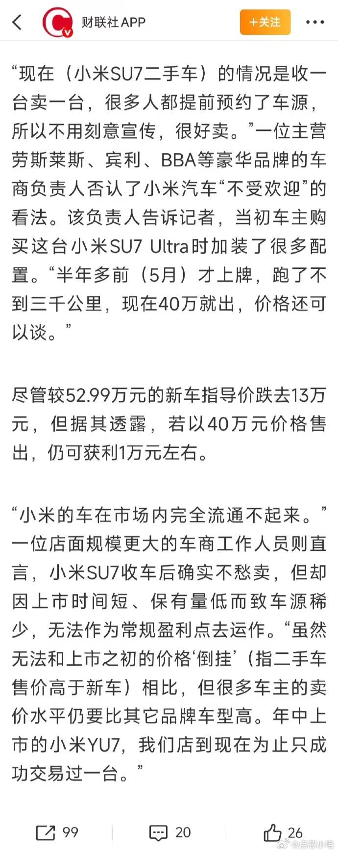 小米二手SU7 Ultra35万没人要很多车商下跪哭惨也好,到处制造价格争议也好,说白了都是引流手段,最终目的还是低价收车高价卖出。而且现在很多人买小米SU7都喜欢个性化选装,车商手里那些配置固定的现车不好出手,他们当然着急了。从小米SU7的二手市场表现就能看出来,实际上根本不像他们说的那样。去正规平台一查就知道,SU7的二手车价一直很稳,24款现在均价还在20万以上。为什么会有这些乱七八糟的声音?说白了就是之前不少车商当黄牛囤车,想着加价赚一笔,结果现在交付量上来了,价格回归正常水平,他们亏了钱就想靠唱衰压进货价补窟窿。所以这些消息真的看看就好,犯不着跟着焦虑。车子保不保值,看真实的市场流通数据和口碑就够了。