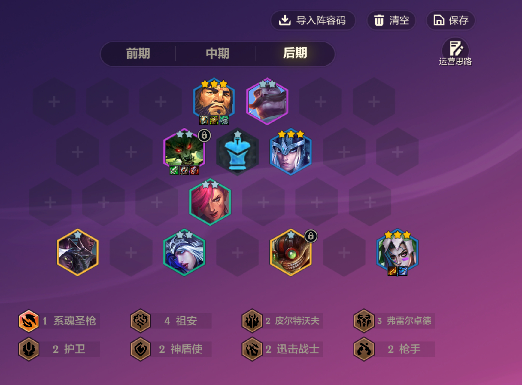 当前版本最强阵容:「闭环金克丝」,验过牌,大家可冲。过渡:2狙神+2前排,有金克丝的话,就2枪手+2前排。装备:金克丝:羊刀+巨杀核心必带!第3件根据局势,科技枪或轻语,如果控制多就补水银。前排肉装洛里斯猪妹,谁3星给谁。狼人捡垃圾。D牌节奏:7级D出3星金克丝,存钱拉8,补个枪手,阵容成型。9级后补千珏或者炸弹人,提高上限。 符文:经济或者D牌海克斯优先,战力海克斯根据场上局势看着来。金铲铲