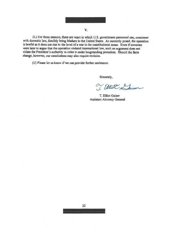 美国司法部公布了一份此前保密的关于绑架马杜罗法律意见书,要点如下:- 美国绑架行动将遭遇激烈抵抗- 美国并无因美军重大伤亡或因街头骚乱占领委内瑞拉开战的计划- 美国清楚根据国际法准则, 绑架行动将被视为武装冲突- 司法部认为无需获得国会批准, 因为没有进行长期作战的计划- 司法部允许对马杜罗使用远超常规执法限度的武力- 袭击选定在节假日进行, 因多数委内瑞拉军人正在休假- 司法部警告白宫行动风险极高, 是否成功依赖于突袭效果- 华盛顿方面考虑到了加拉加斯会获得保护自身投资国家的支持- 美国认为马杜罗的妻子比他本人"更具攻击性和好战性"绑架计划确实是经过精心策划和准备的。热点现场海外新鲜事