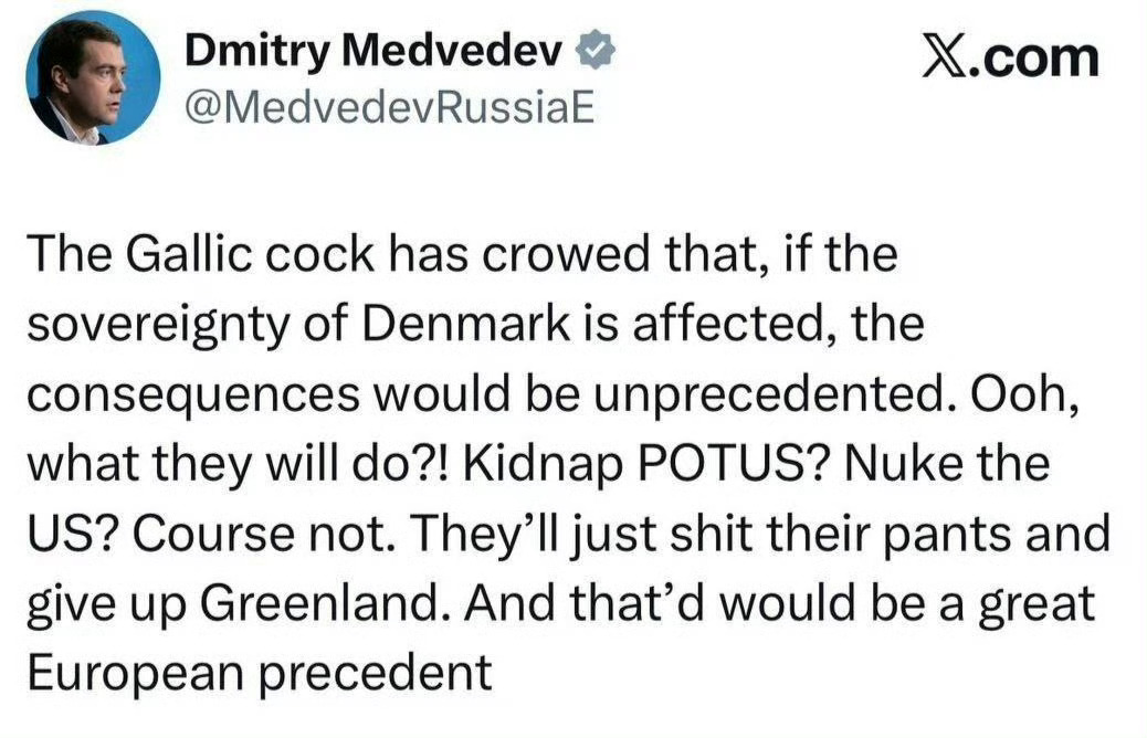 特朗普昨天发文"…北约: 告诉丹麦立刻滚出格陵兰岛!俩狗拉雪橇不够!保护格陵兰岛只有美国能做到!去年丹麦情报机构就曾警告俄罗斯和东大对格陵兰岛和北极的军事意图。"然后给了个去年丹麦情报机构警告的链接。接着俄罗斯最能骂架的梅德梅杰夫登场:"…荷兰的那个性变态小公鸡(指北约秘书长吕特)说, 如果丹麦的主权受到侵犯, 后果将是前所未有的,我们想知道会发生什么, 会绑架美国总统吗?会对盟友使用核武器吗?不~当然不会,他们只会被吓得屁滚尿流的交出格陵兰岛,而这是欧洲绝佳的一个先例。"现在吕特不太好办了,向着欧洲美国会收拾他, 向着美国欧洲会收拾他。里外不是人!热点现场海外新鲜事