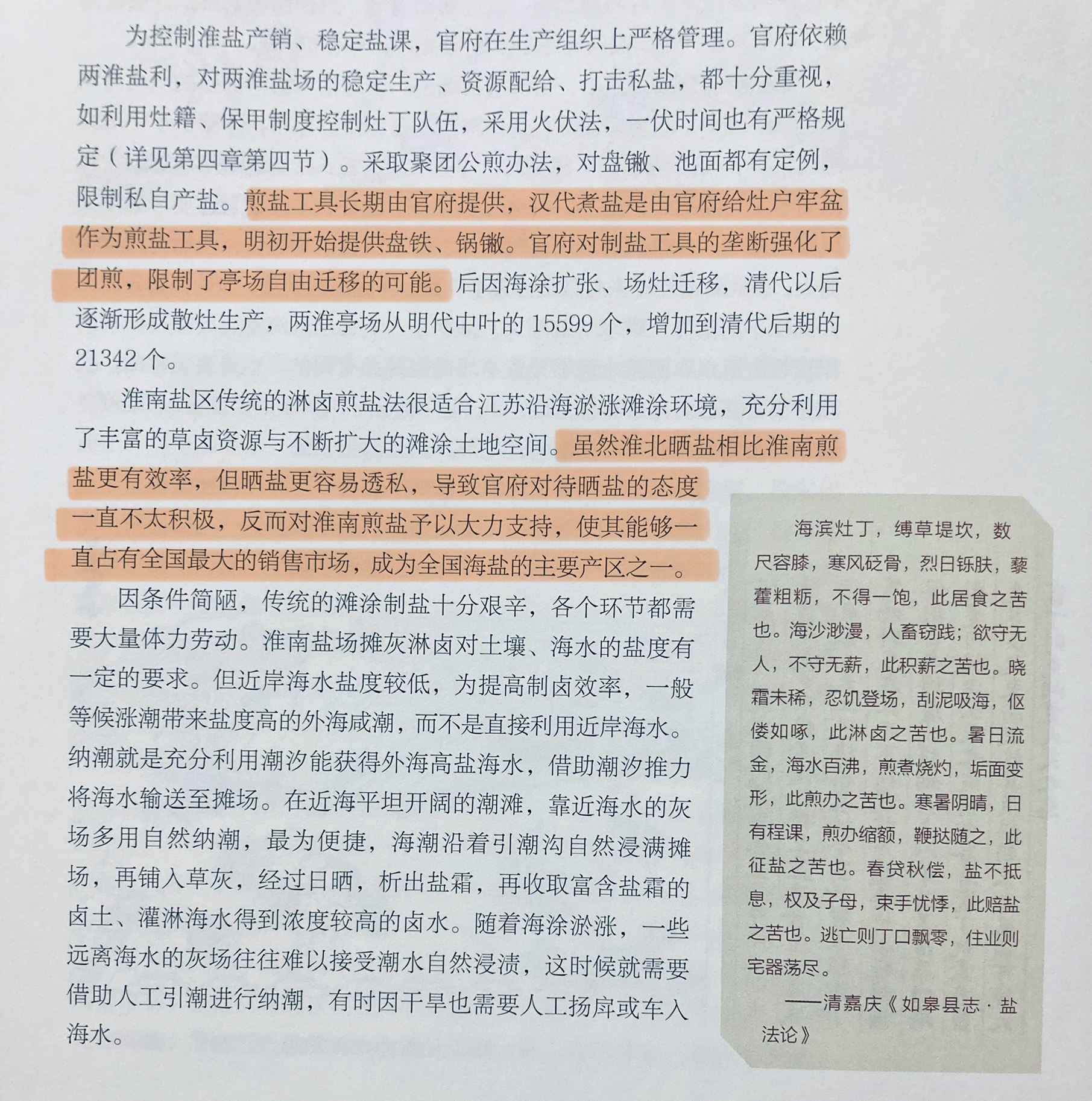 古代算政治账优先于经济账的一个案例在海盐生产过程中,只要土质和光热条件符合要求,晒盐在生产效率和成本上显著优于煎盐。但对实行盐业专营的古代王朝而言,晒盐因为过于便捷不易监管,使得私盐生产难以禁绝,而煎盐必须铁质容器和燃料(荡草),官府通过垄断二者的供应,便能严密监管海盐生产。因此对淮北晒盐淮南煎盐的既有生产格局,明清朝廷一方面违背经济效益原则,打压淮北扶植淮南,另一方面对淮北晒盐人为增加不必要的生产条件要求,提高对其生产过程的监控能力