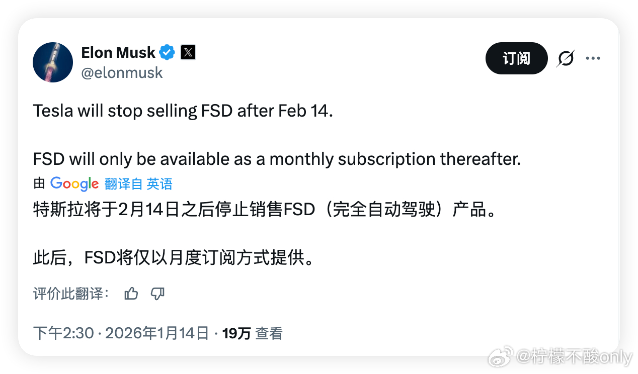 特斯拉FSD停售不知道国内用户买不买账!毕竟国内大都免费!1 月 14 日下午,马斯克在社交媒体「X」上突然宣布,从美国当地时间 2026 年 2 月 14 日起,将停止对外销售 FSD 选装包。届时,FSD 服务将通过付费订阅的形式向外界提供,一次性买断服务将不复存在,消费者只能通过订阅模式来体验 FSD。大v聊车微博汽车