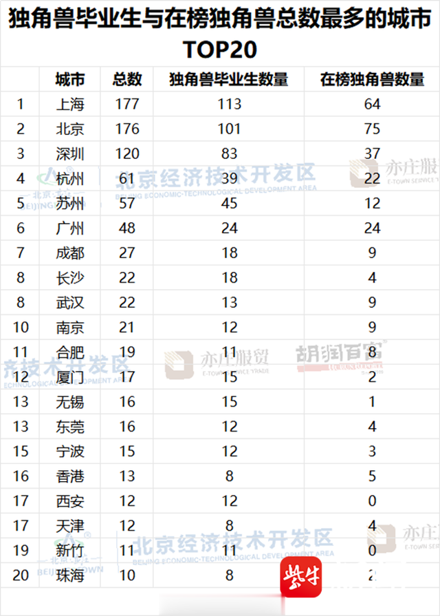 独角兽毕业生与在榜独角兽总数最多的城市TOP20中,苏州以57家(45家独角兽毕业生+12家在榜独角兽)位居第5,南京以21家(12+9)居第10,无锡以16家(15+1)位居第13。