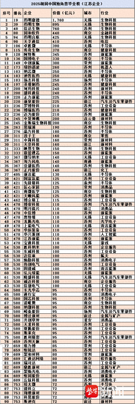 江苏上榜企业据胡润中国独角兽毕业榜制表