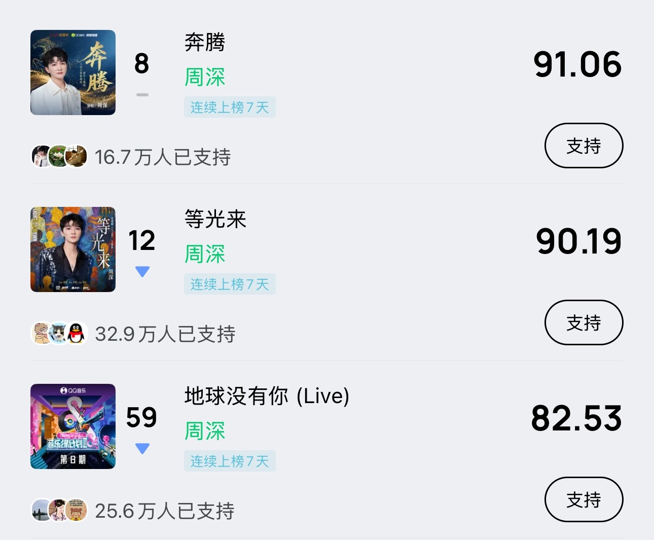 周深 📣 1.15 巅峰潮流 📣米米们晚上好,每歌做6个动作路径:Q音-乐馆-排行-潮流巅峰✅《奔腾》✅《等光来》✅《地球没有你(live)》完成『支持』让更多人听到深深