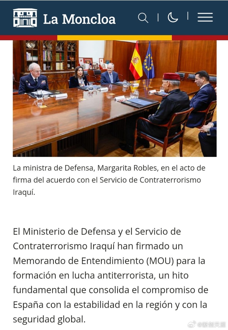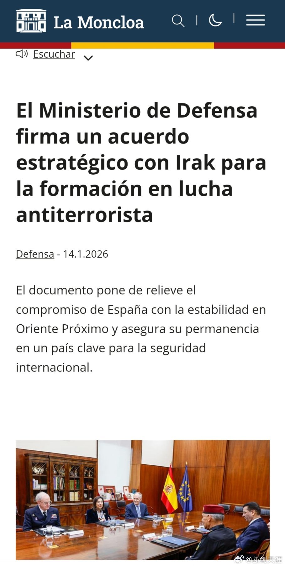 国防部与伊拉克签署了一份关于反恐作战培训的战略协议。国防 - 2026年1月14日该文件强调了西班牙对近东地区稳定的承诺,并确保其在一个对国际安全至关重要的国家持续存在。 西班牙国防部与伊拉克反恐局已签署一份反恐作战培训谅解备忘录(MOU),这一重要里程碑进一步巩固了西班牙对地区稳定及全球安全的坚定承诺。(西班牙官网)