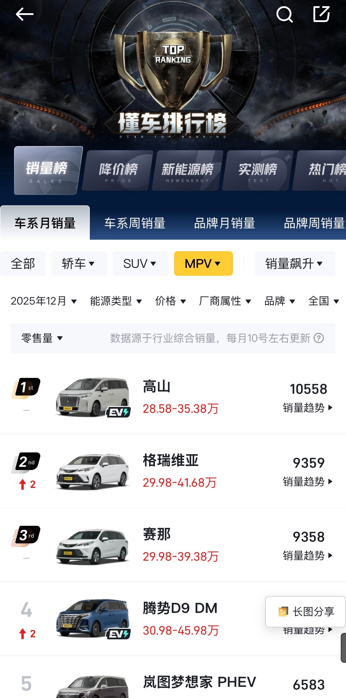 魏牌高山全国mpv销量冠军 MPV冠军居然被魏牌高山抢走了,12月销量为10558辆,是别克GL8的两倍多,价格还不低,售价为28.58-35.38万元。长城这两年别看着总销量下去了,但总有惊艳的产品问世,比如坦克系列,比如这台高山。所以大家别光看着几个大厂看着总销量挺好的,看看它们主力的车型,各种小型车占了大头。长城没有做这样的车型,做了不赚钱。假设长城也这样,多做几台这样的车销量就上去了,