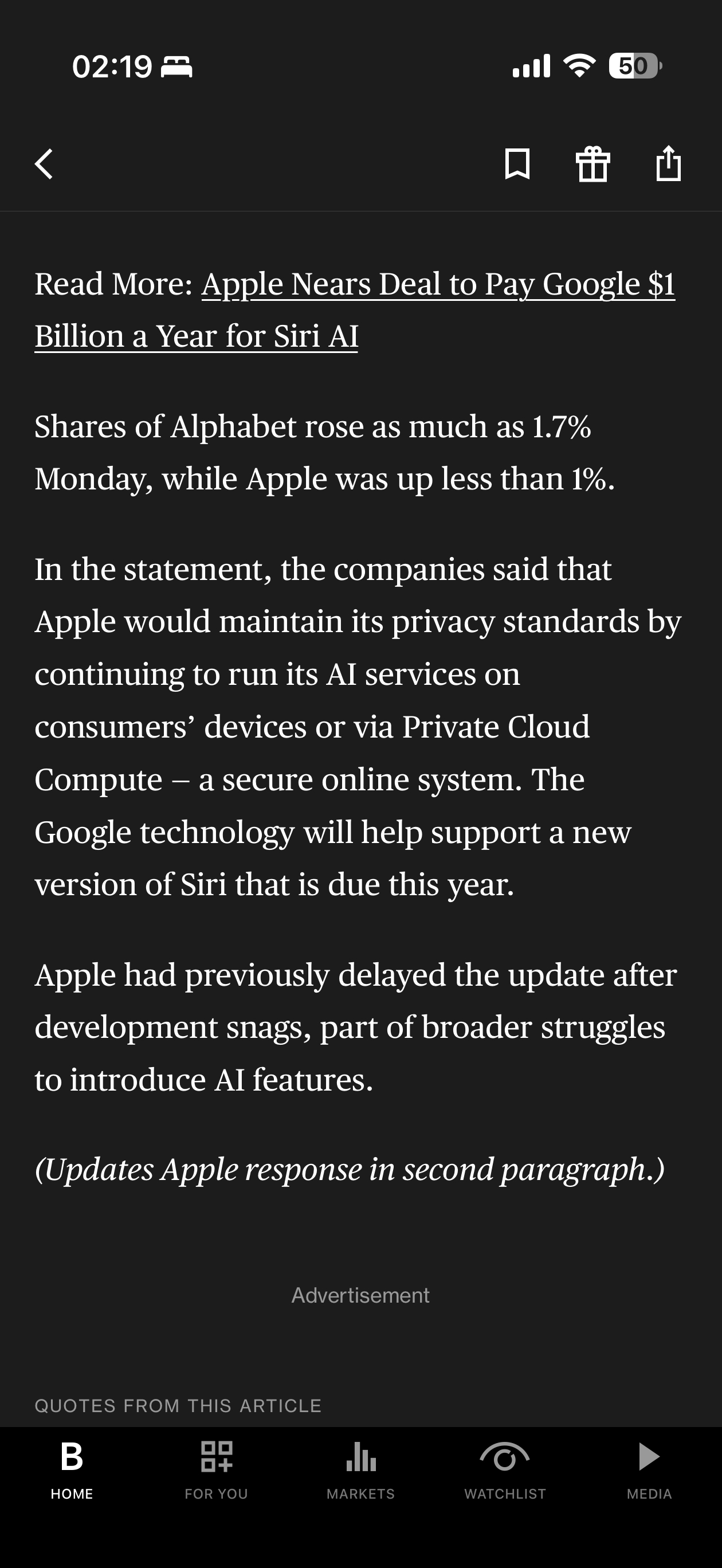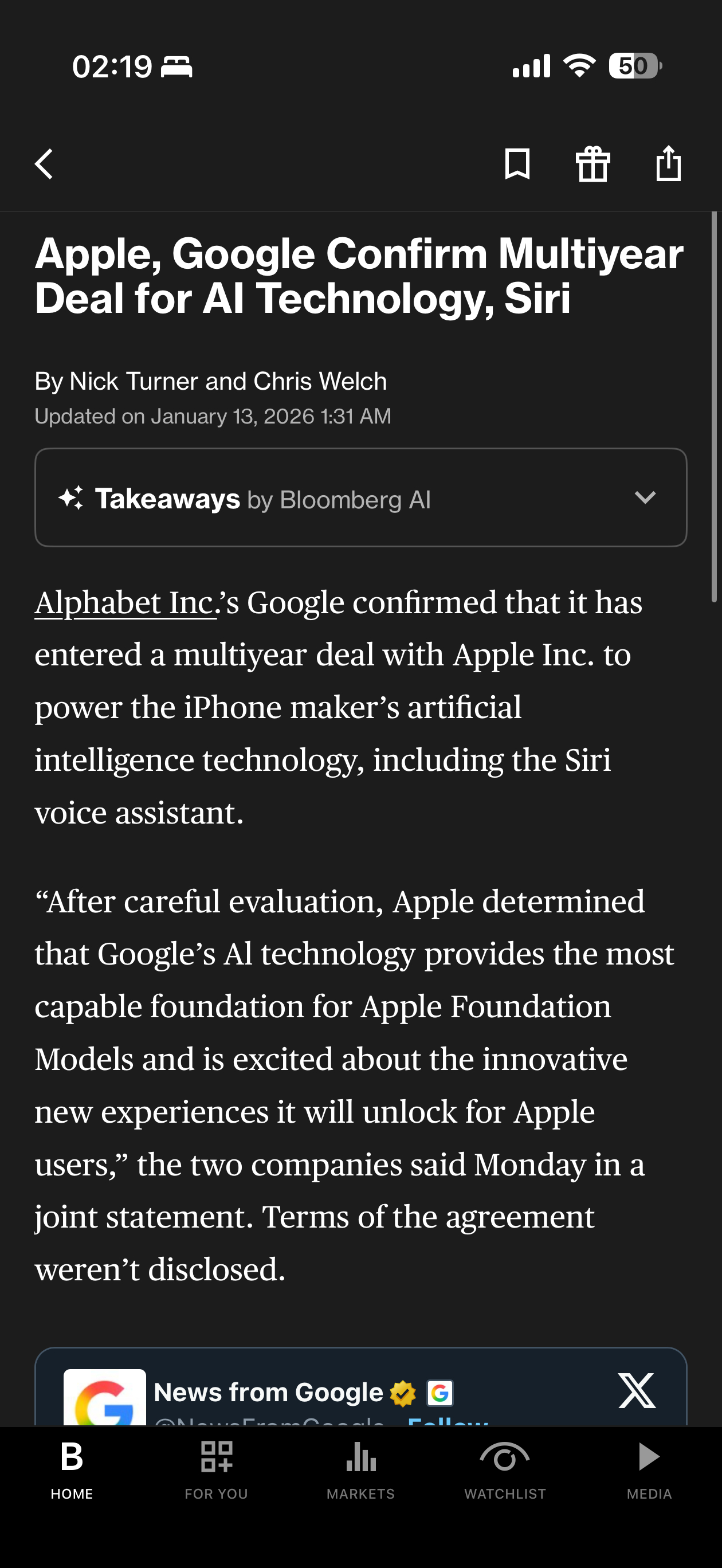 两家联合宣布:Google 将为 Apple 的下一代 Siri 提供核心 AI 能力。两家股价均未见太大波澜。