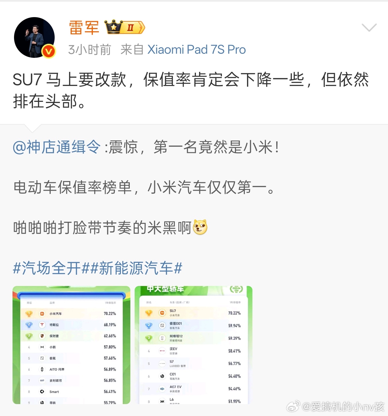 都说新势力新能源不保值,这么看小米二手车保值率妥妥在行业平均水平,甚至比不少同级别车型还能打啊让我意外的是SU7 Ultra!作为小众性能车,本来就没法和普通车型比保值,但架不住二手商家敢收啊~所以买这车开几年过过瘾再卖出去其实也不太亏?!