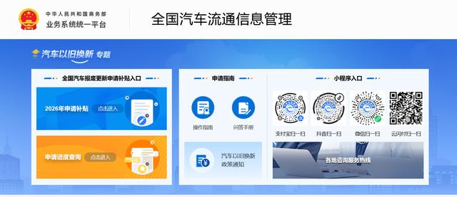 在汽车领域,补贴政策按照《2026年汽车以旧换新补贴实施细则》执行。其中,汽车报废更新补贴申请,消费者可通过登录全国汽车流通信息管理系统网站或“汽车以旧换新”小程序提交。