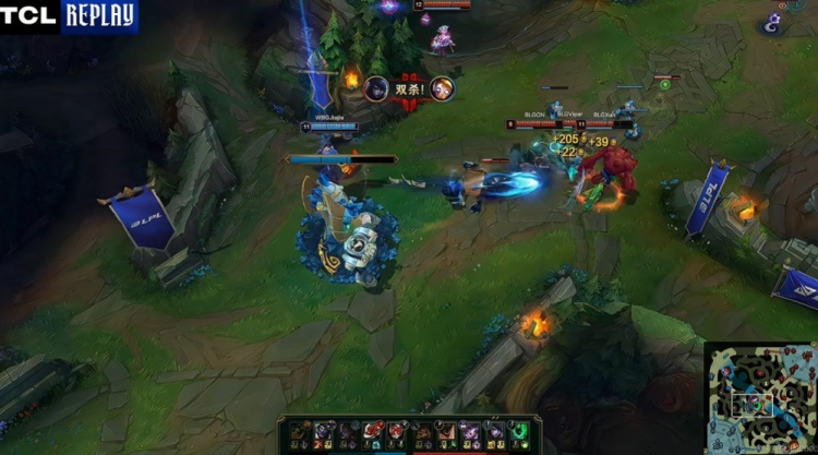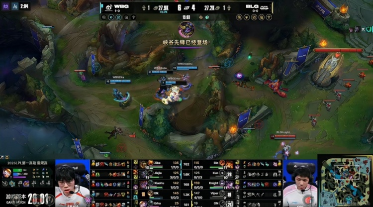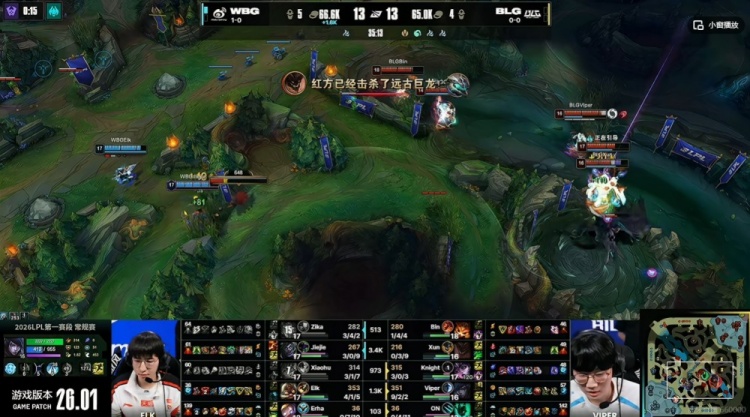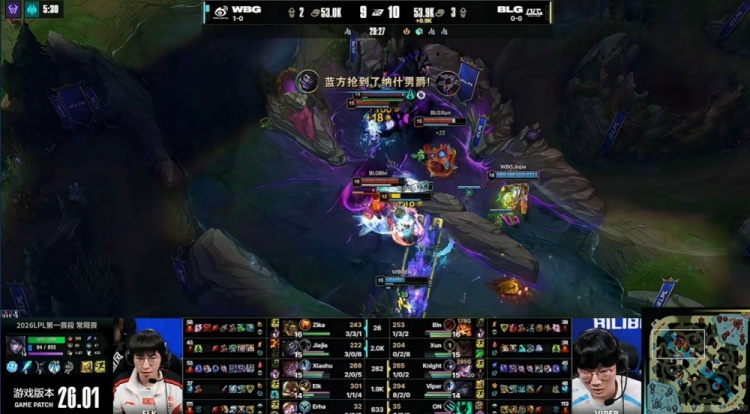 [20:20]BLG借助厄斐琉斯红白刀抱团直接Rush掉了新生的大龙!WBG抱团留住了BLG野辅!Bin纳尔单带掉了上路一塔!BLG再拆中一塔!这波过后BLG反超经济!