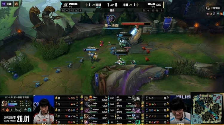 [6:01]WBG三人包上,最终是Jiejie蒙多闪现拍击杀掉了Bin纳尔拿下一血!BLG则是换掉第一条小龙!