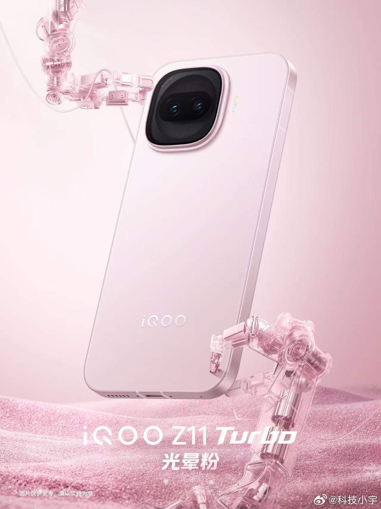 iQOO Z11 Turbo高颜值、有质感、好手感!四款配色:「沧浪浮光」、「光晕粉」、「天光白」、「极夜黑」; 旗舰质感:旗舰同款高强度航空级铝合金金属中框,后盖玻璃细腻舒适,「极夜黑」为玻纤后盖,大R角设计,精致又耐看;IP68/IP69防尘防水; 舒适握持:6.59英寸黄金中屏,74.42mm宽度,手感爆表;点睛设计:缓坡Deco以金属勾勒方圆形状,打造“机器之眼”的悬浮感。
