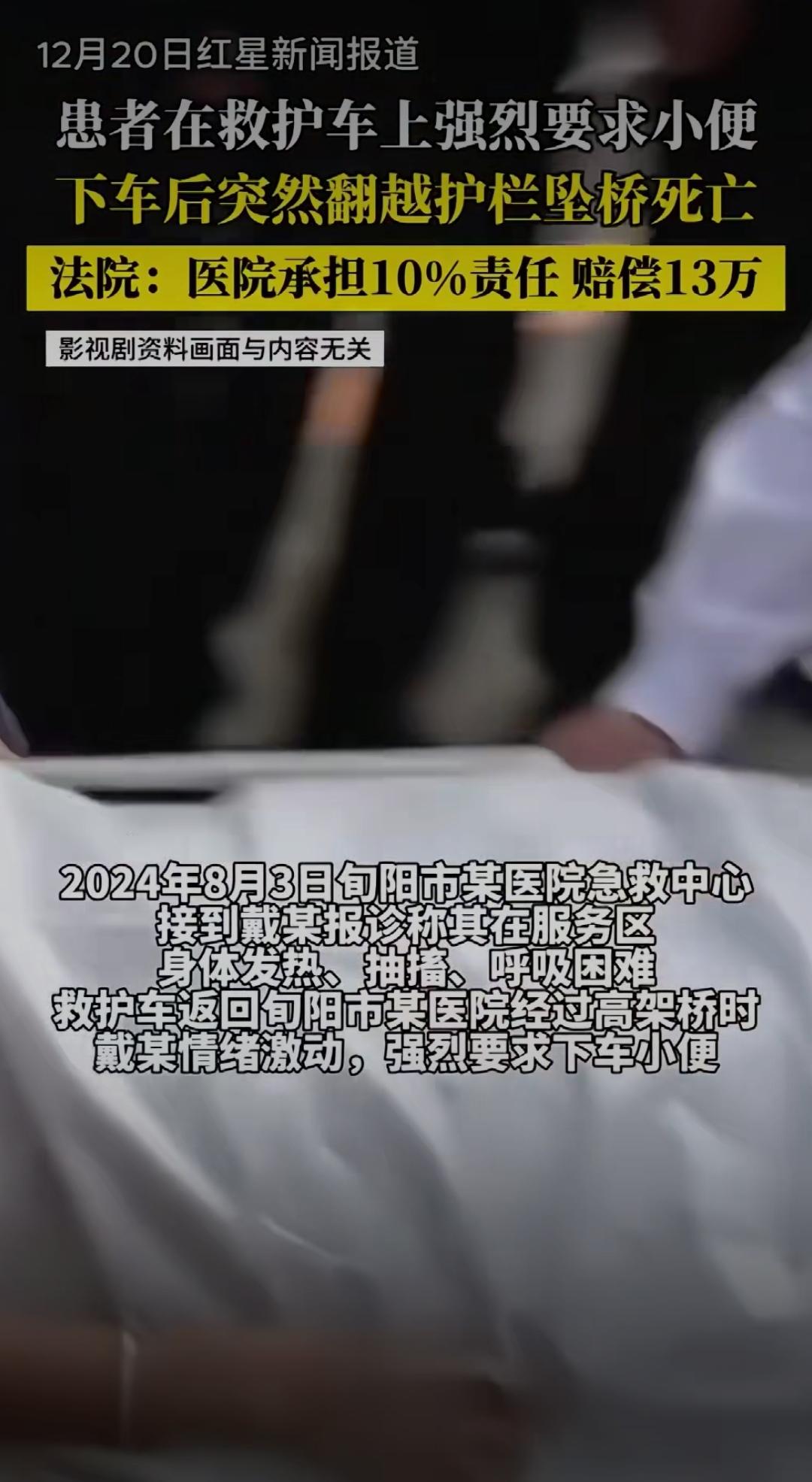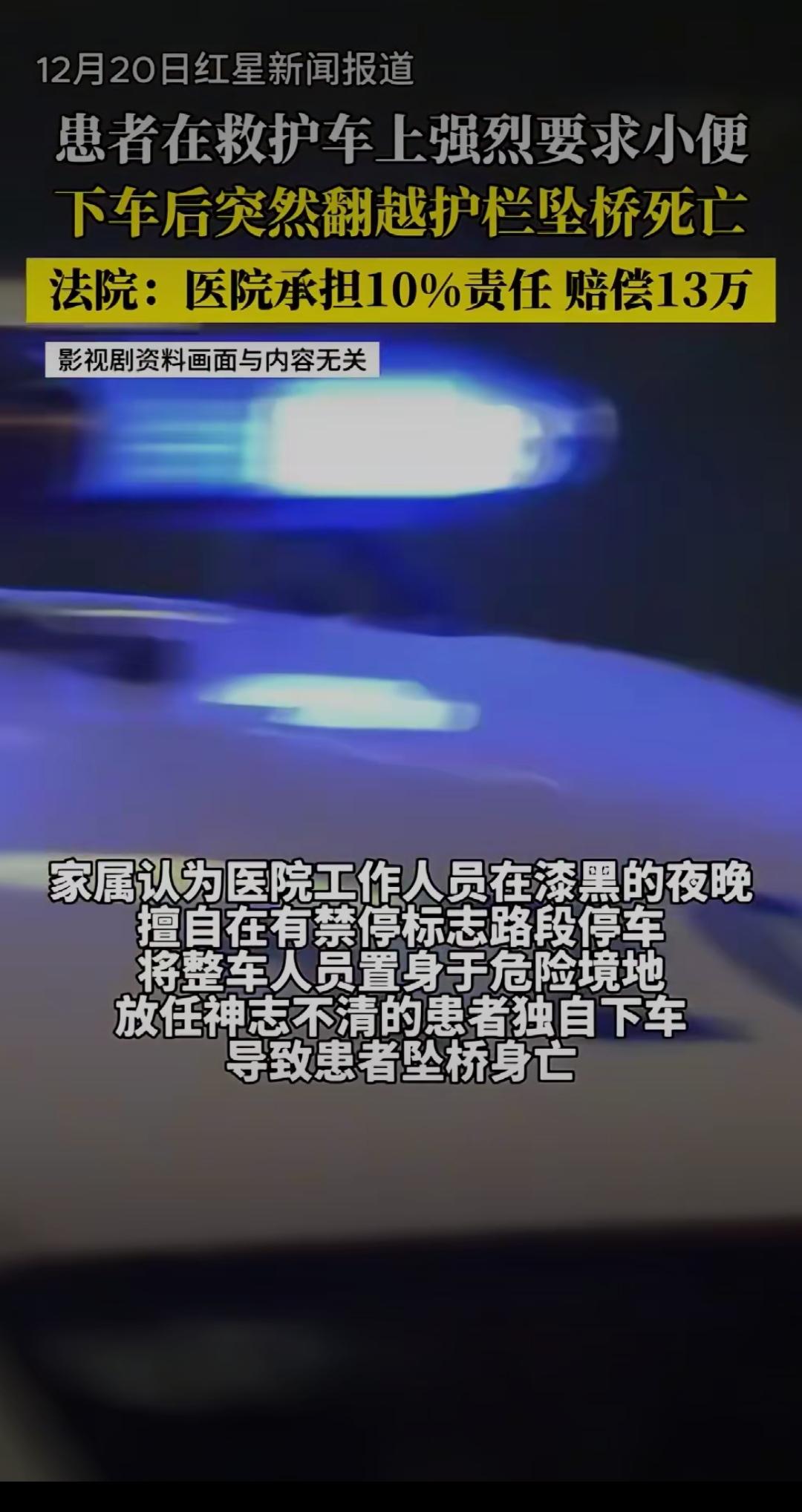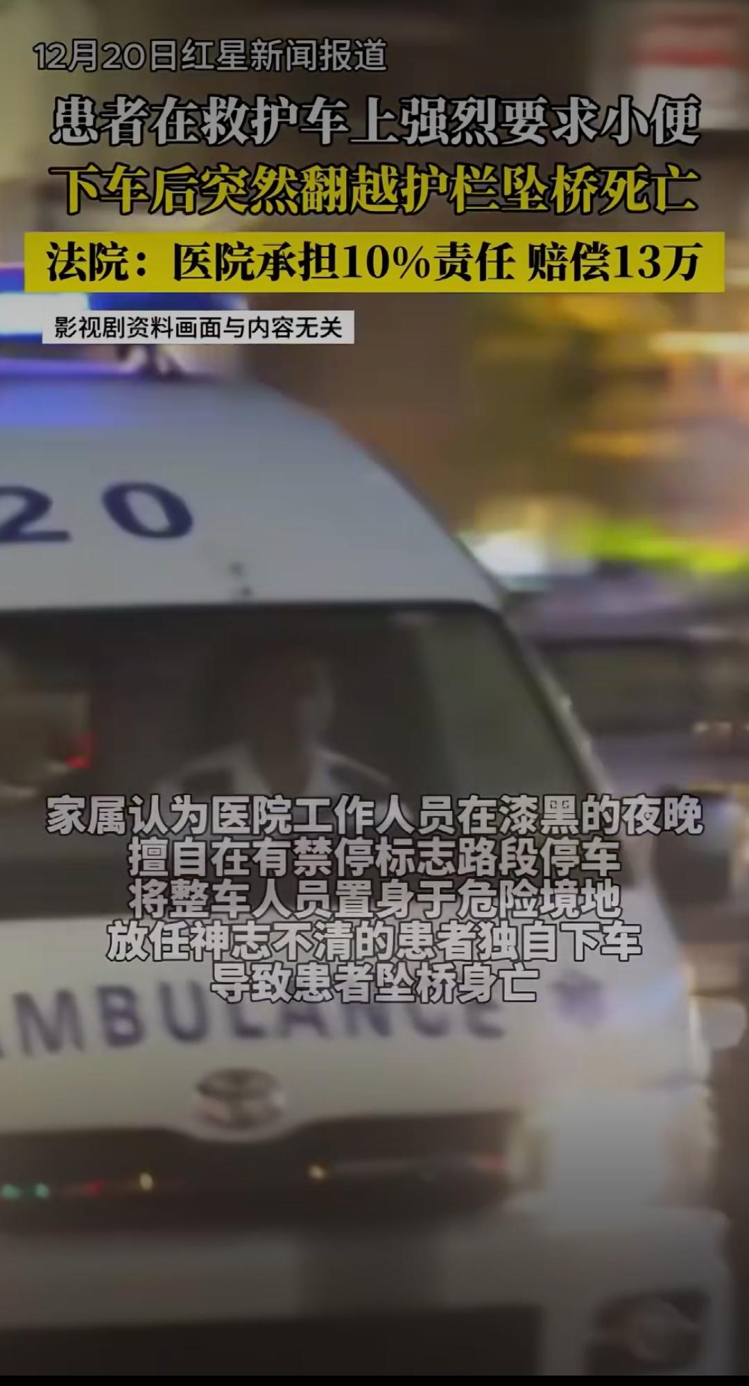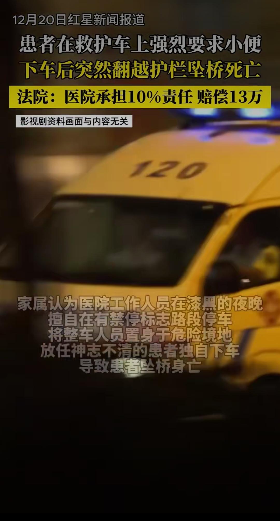 救护车禁停区停车酿悲剧!患者下车小便坠桥,136万索赔仅获赔13万引全网争论违规停车酿大祸 警灯闪烁的救护车本是生命方舟,却在陕西旬阳的高架桥上酿成惨剧。12月20日红星新闻报道,货车司机戴某突发高烧抽搐,被救护车转运途中强烈要求下车小便,司机竟在高架桥禁停路段停车,戴某下车后突然翻越护栏坠桥身亡。 家属悲痛欲绝,怒诉医院三大过错:漆黑夜晚擅停禁停路段、放任神志不清的患者独自下车、未采取任何防护措施,索赔136万余元。而医院则喊冤,称监控显示戴某神志清醒,还曾攻击医护,坠桥是无法预见的自杀行为。 旬阳市法院的判决让争议升级:戴某自身行为是死亡主因,医院无需担主要责任,但作为专业机构,违规停车且陪护不足,未尽到高度审慎义务,最终判定医院承担10%责任,赔偿13万余元。 判决一出网友炸锅:有人替医院叫屈“患者突发极端行为防不胜防”,也有人怒斥“禁停区停车就是违规,安全防护太疏忽”。这场悲剧戳中了院前急救的两难困境——满足患者基本需求的人性化处置,该如何守住安全底线? 《民法典》明确医疗机构需对患者安全负合理注意责任,而目前院前急救对特殊场景下车管理缺乏明确指引。13万赔偿换不回逝去的生命,却为行业敲响警钟:急救的“人性化”绝不能凌驾于安全规范之上。 你觉得这10%的责任判得合理吗?欢迎在评论区留下观点。需要我整理类似案例的责任划分对比,帮你更清晰看懂争议焦点吗?