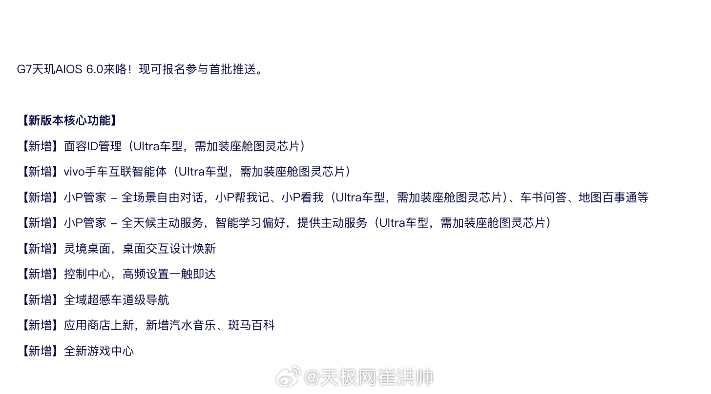 小鹏G7车主注意!天玑AIOS 6.0首批推送报名已启动新版本核心功能速览:-新增面容ID管理(Ultra车型,需加装座舱图灵芯片)-新增vivo手车互联智能体(Ultra车型,需加装座舱图灵芯片)-小P管家大升级,全场景自由对话+主动服务,(部分功能需Ultra车型 + 加装芯片)-新增灵境桌面、全域超感车道级导航、应用商店上新、全新游戏中心……话说,你最想体验哪个新功能?评论区聊聊小鹏G7小鹏汽车新能源汽车