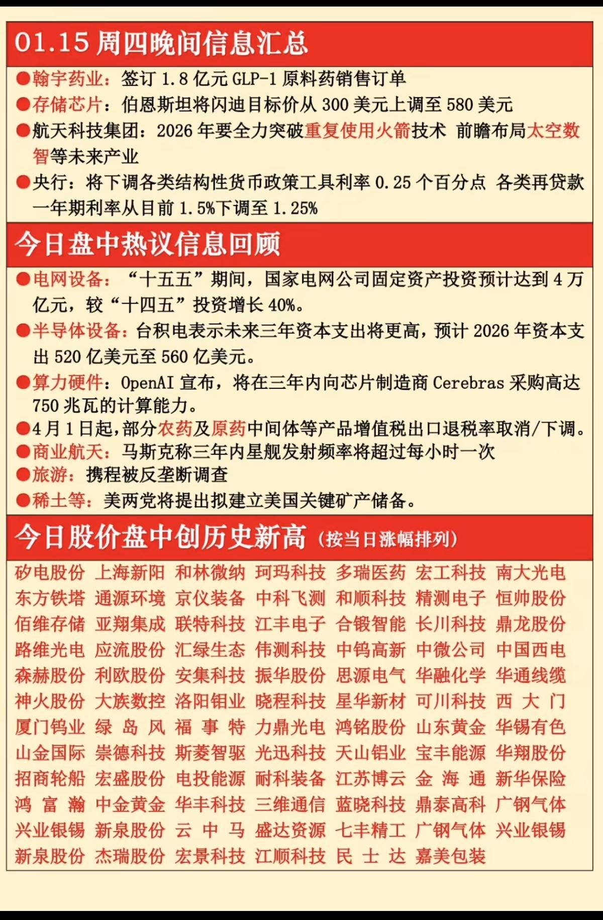 1.16周五 晚间 财经信息汇总! 1.存储芯片,再次涨价 2.降息 3.电网设备 4.半导体设备 5.算力硬件 6.商业航天