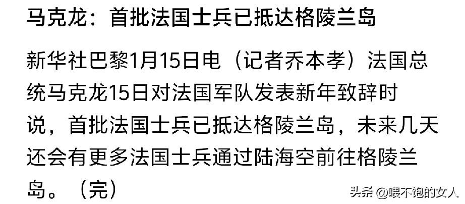 牛逼啊!意外,太意外了。特朗普会不会想,法国这是先下手为强吗?[捂脸] 法国这动作有点快啊,前面说要在格陵兰岛设什么领事馆,今天就派兵过去了,难道是保护未来的领事馆吗? 为你点个赞吧,特朗普估计眼都发绿了,晚上又睡不着觉了。