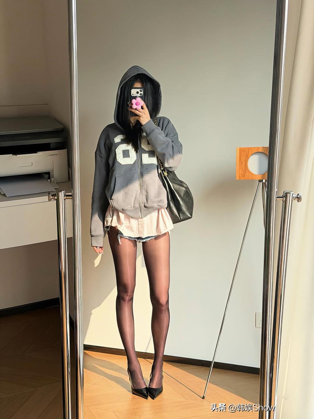 灰色卫衣+粉色短裙,搭配黑色丝袜和尖头鞋,简约又时尚!👗👠大长腿