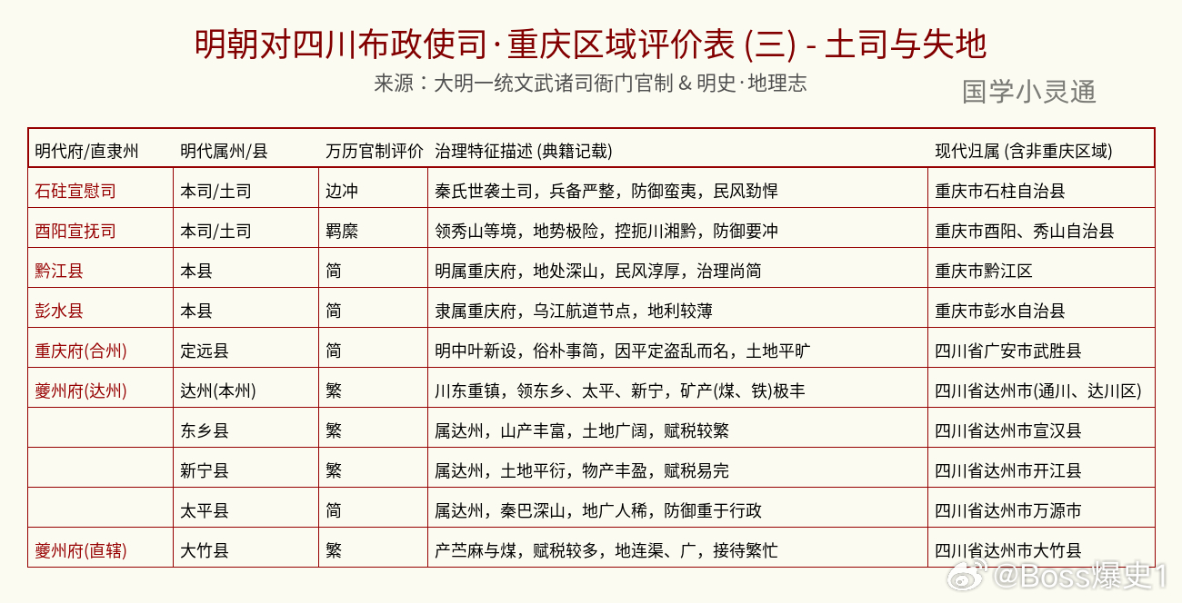 昨天发布了关于四川的内容,但因为没有重庆部分没有梳理完,所以很多重庆的小伙伴都进行了留言,今天补充更新,还请宝子们谅解!此外,因为数据很庞杂,还需要古今对照,所以可能存在疏漏,如有遗漏大家评论区或粉丝群留言即可,后续补充回复!🏢 顶级内卷中心:巴县(今渝中、江北、沙坪坝一带) 评价直接给到“最繁剧”! 作为府治所在地,双江汇流,商贾云集,是名副其实的“川东大门户”。官方描述说这里“词讼赋税极重”,说白了就是生意多、官司多、收税压力大,这里的官员和百姓估计天天都在忙忙碌碌。🚢 码头商业巨头:合州、万县、江津合州(合川):评价是“冲繁”,嘉陵江枢纽,驿传往来极其繁忙,还有产盐和铁的“泼天富贵”。万县(万州):被称为“长江转运重镇”,大批商人在那儿集合,公差劳役也相应很重。江津:水陆转运枢纽,地利饶裕,产的名牌产品在当时就很有名。⚔️ 硬核边防要塞:奉节(夔州)、石柱奉节:评价是“极冲/地险”,扼守三峡夔门,关税和兵防重地,守备极其森严。石柱:秦氏世袭土司,兵备严整,民风劲悍,是硬核的“防御担当”。⛰️ 职场黑洞(极度累人):巫山、綦江巫山:楚蜀咽喉,山路崎岖,评价是“驿传劳费,接待频繁”,基层工作人员真的辛苦。綦江:控扼川黔要道,是兵防重地,还要产铁,差役全府最重。🍃 这种地方最清闲:璧山、武隆、大宁 关键词:“简”。璧山:地平人行,民淳事简。武隆:虽然扼守峡口,但事务尚简。大宁(巫溪):虽然产盐课税,但地处深山,民风淳朴,事情也少。各位重庆小伙伴,你们老家在明朝是负责“搞钱”还是“保安”?评论区聊聊!👇