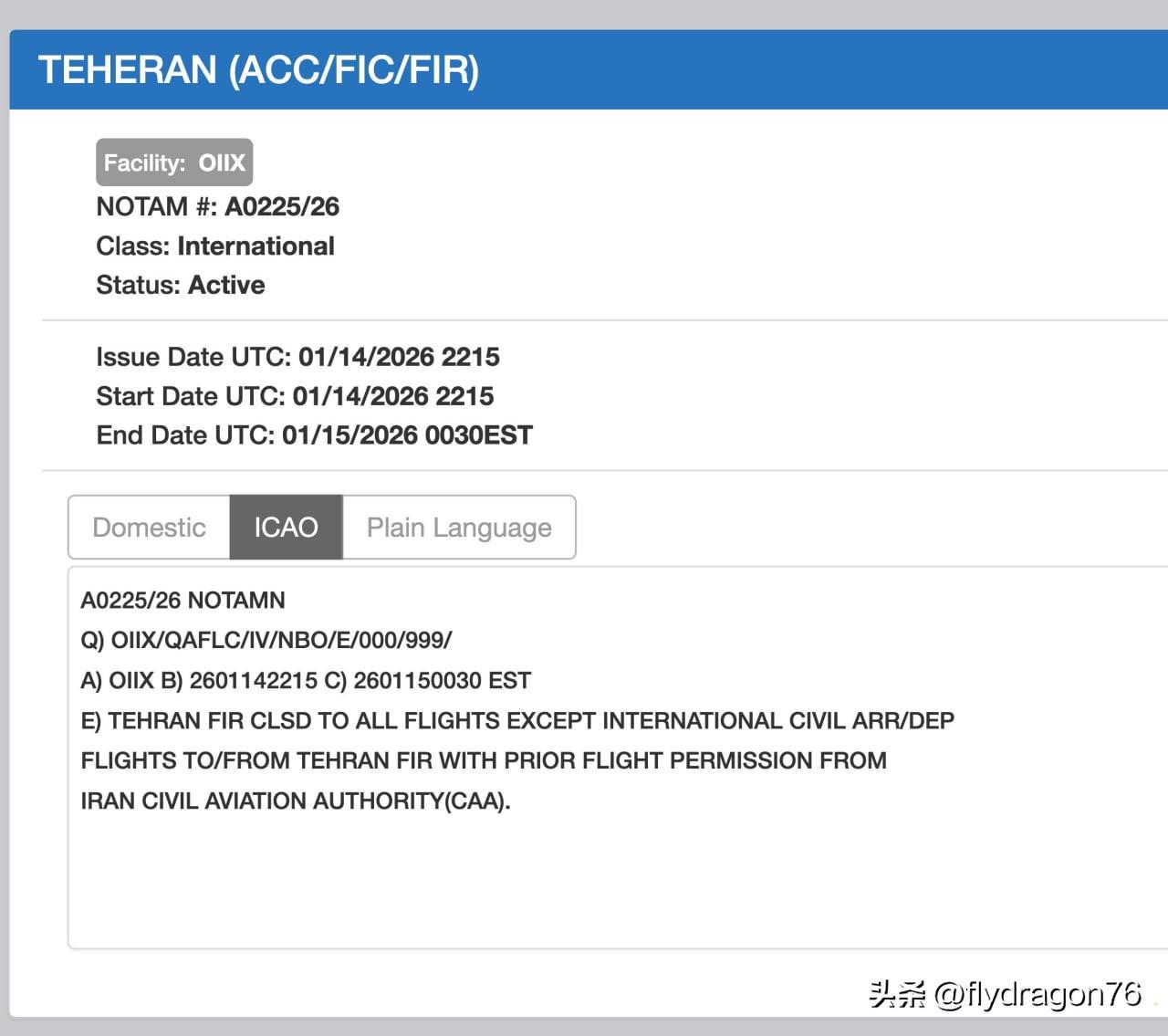 🇮🇷伊朗和伊拉克上空几乎空无一物。 最后一批飞机正在伊朗领空起降,新的航班已不再获得许可。 图二,伊朗已正式关闭其领空,禁止民用飞机通行,并发布了航行通告(NOTAM)。 伊朗伊斯兰革命卫队空天军和伊朗防空部队也已进入高度戒备状态。