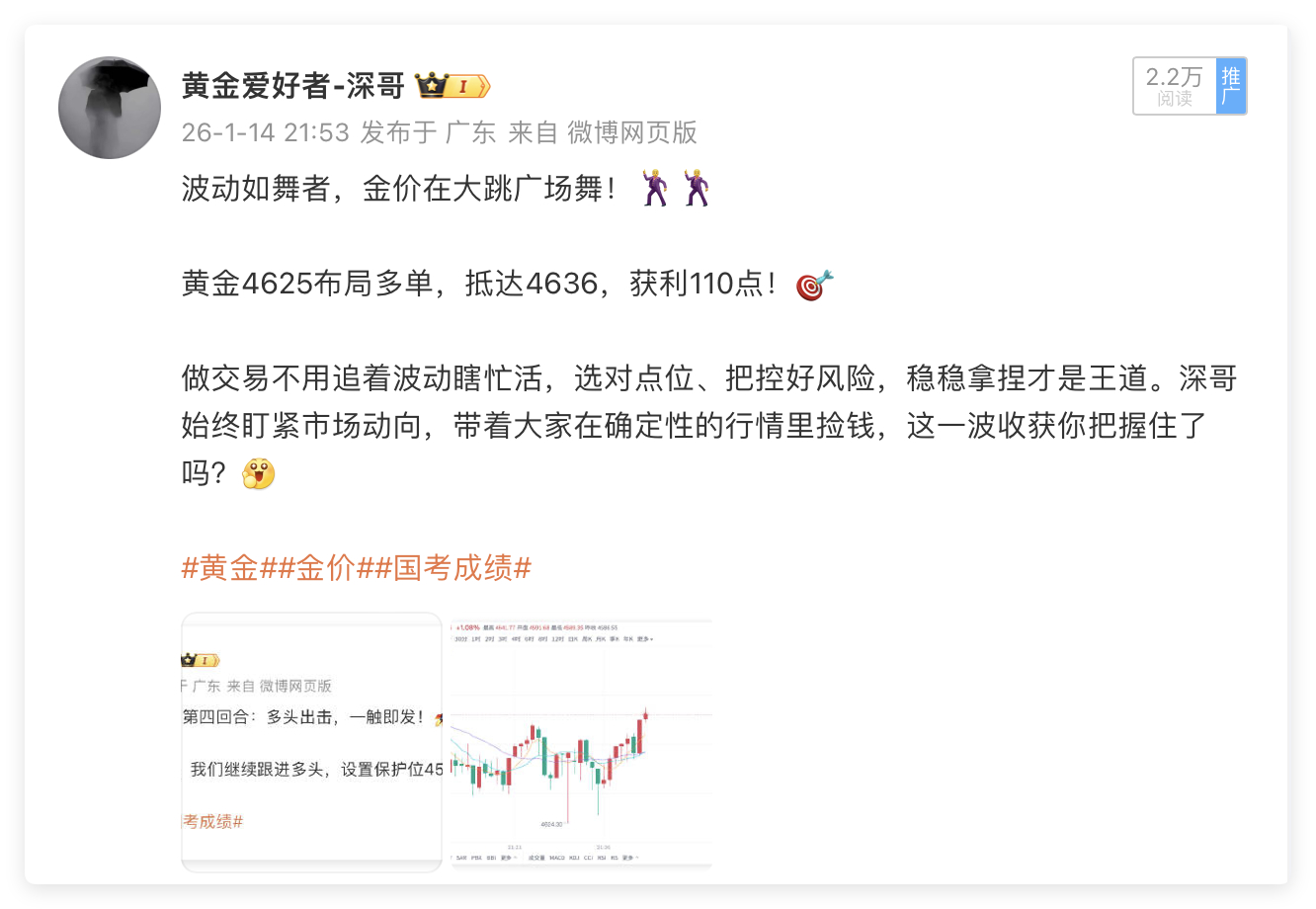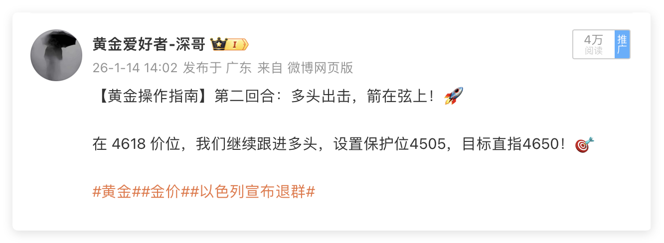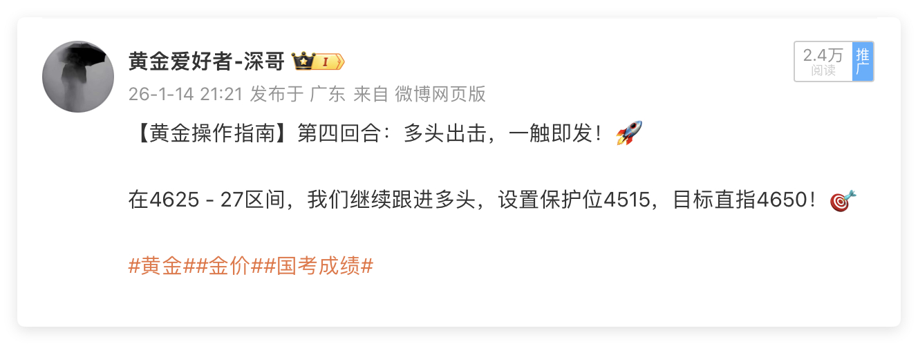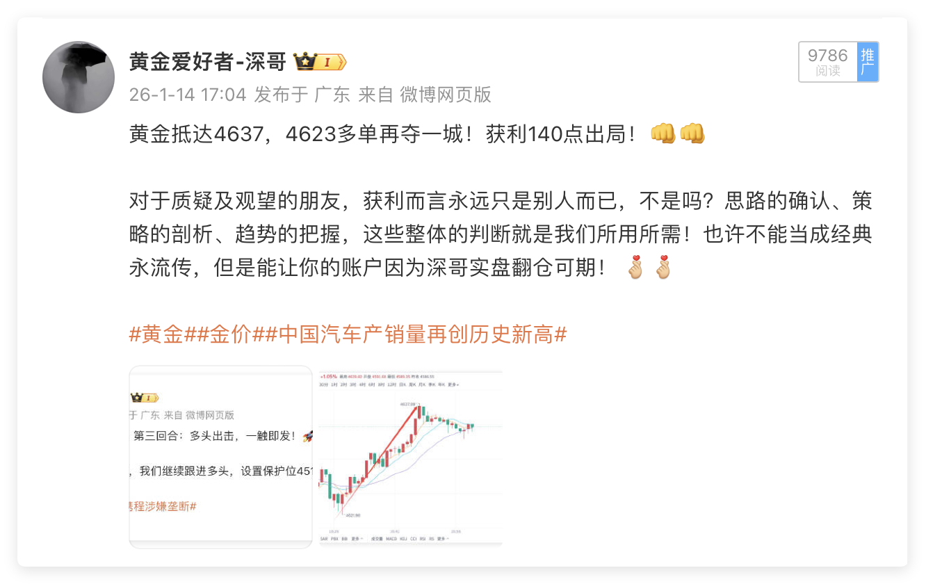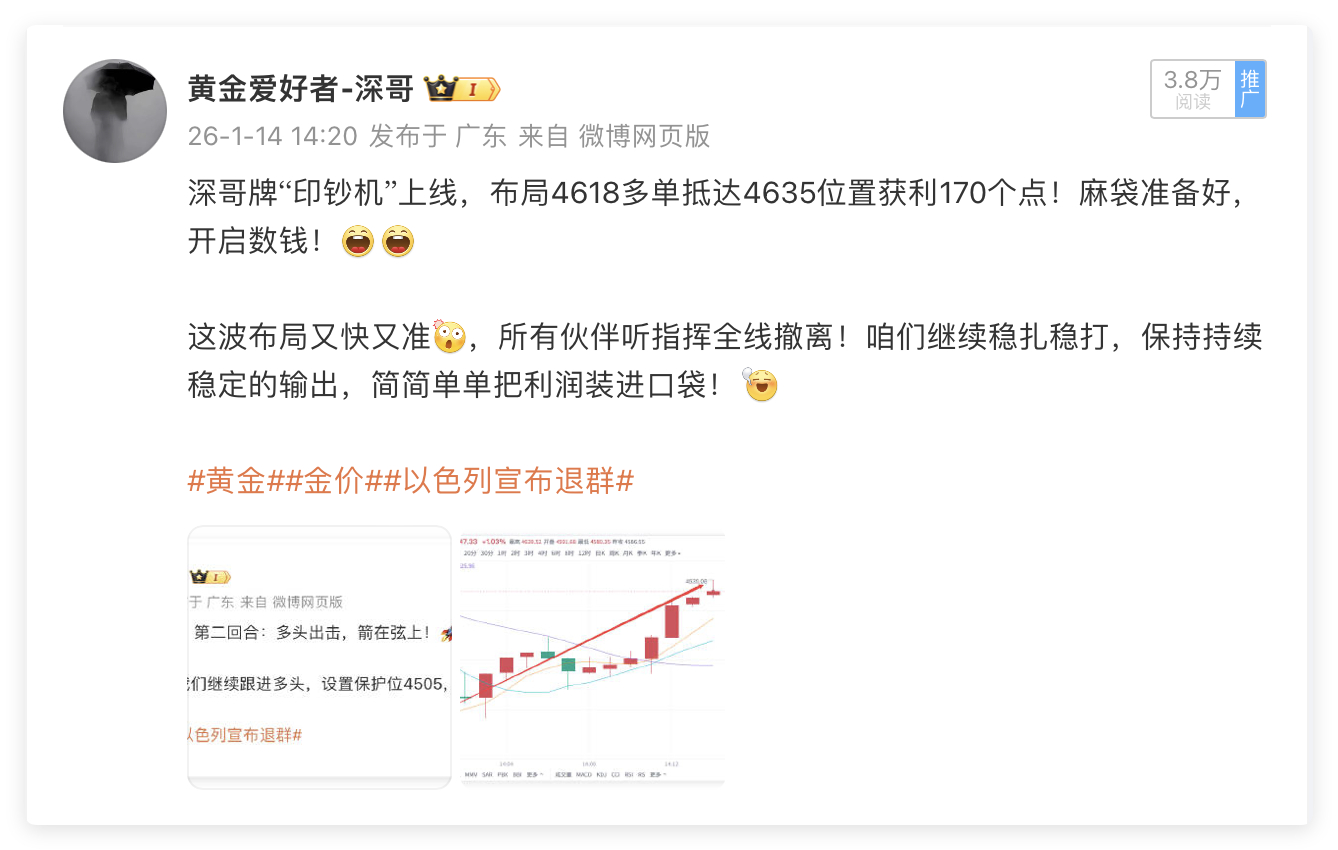 1月14日周三交易回顾:单日战绩560点🎯🎯黄金4625多单,抵达4639出局,获利140点黄金4618多单,抵达4635出局,获利170点黄金4623多单,抵达4637出局,获利140点黄金4625多单,抵达4636出局,获利110点周三黄金交易再传捷报!单日斩获560点丰厚收益,四波多单全部精准止盈,深哥用实打实的战绩印证专业实力!当日黄金行情波动有序,连续布局四笔优质多单:4625点位率先入场,待价格攀升至4639果断止盈,轻松锁定140点盈利;随后在4618关键支撑位再度布局多单,行情如期冲高至4635,斩获170点超额收益;紧接着4623、4625两个点位的多单布局,分别于4637、4636顺利离场,各取140点、110点盈利。四单操作节奏紧凑、点位精准,深哥用果断的操作指令,为爱好者们搭建稳健盈利的桥梁!👊👊