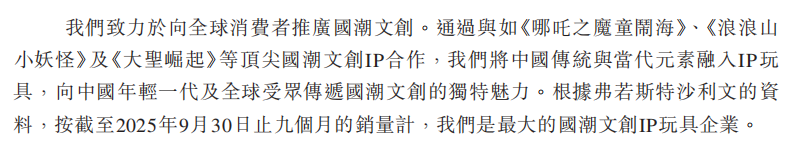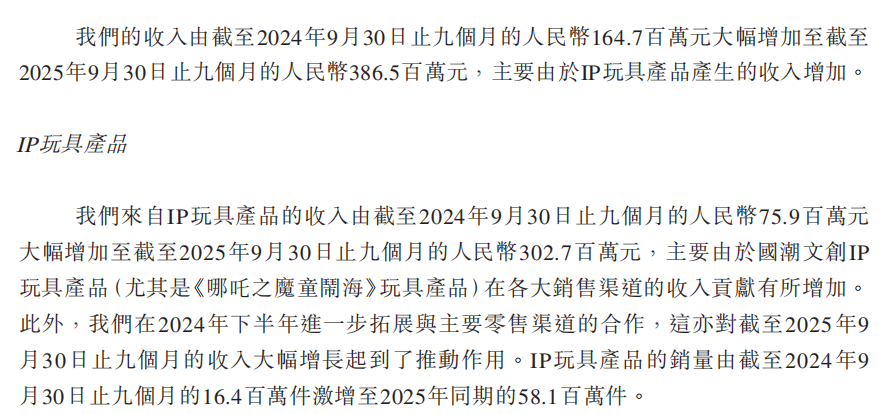 招股书进一步说明,公司25年前9月收入比同期翻约2.35倍,其中IP玩具产品收入从7590万元增长到3亿,这一爆发性增长被直接归功于《哪吒2》相关产品的成功。