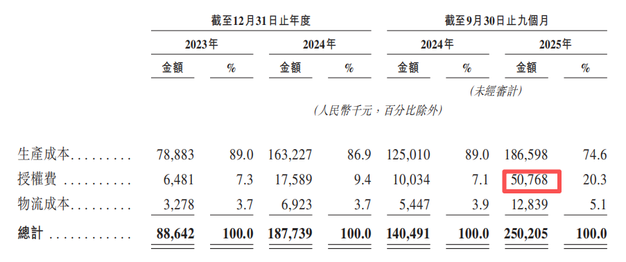从代工转型代理的代价是桑尼森迪的IP授权费用支出随之暴增。桑尼森迪25年前三季度的IP授权费超过五千万元,是去年同期的5倍。横向对比,同期寻求IPO,主打欧美大IP的卡牌公司Suplay授权支出约三千万元。